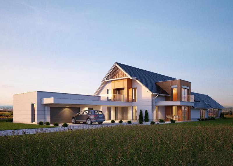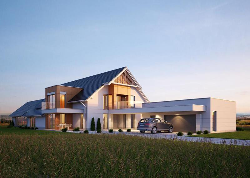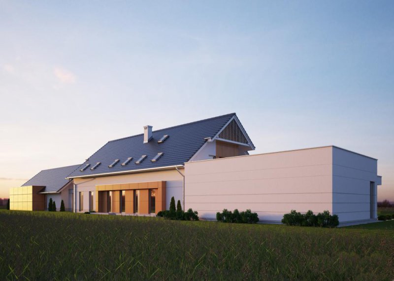 - Elewacje: wykończone tynkiem silikonowym, elewacyjne płyty fasadowe Prodema - HPL, klinkier ceramiczny OSLO firmy ROBEN