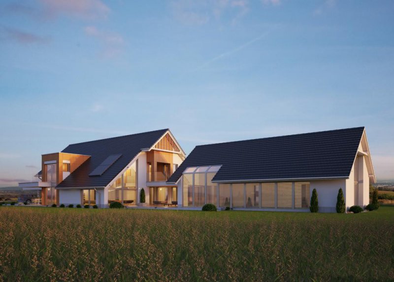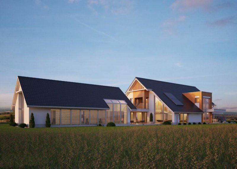 - Pokrycie dachu: dachówką ceramiczną firmy Wienerberger, Actua 10