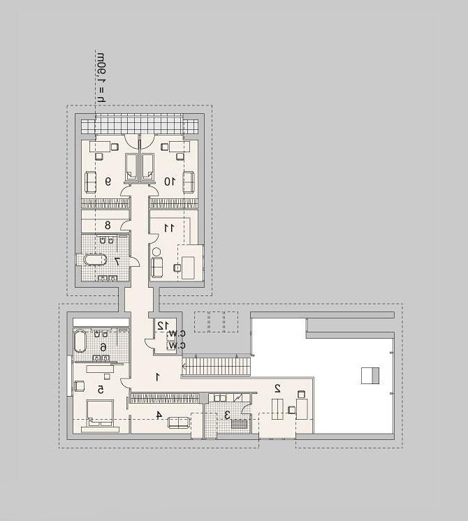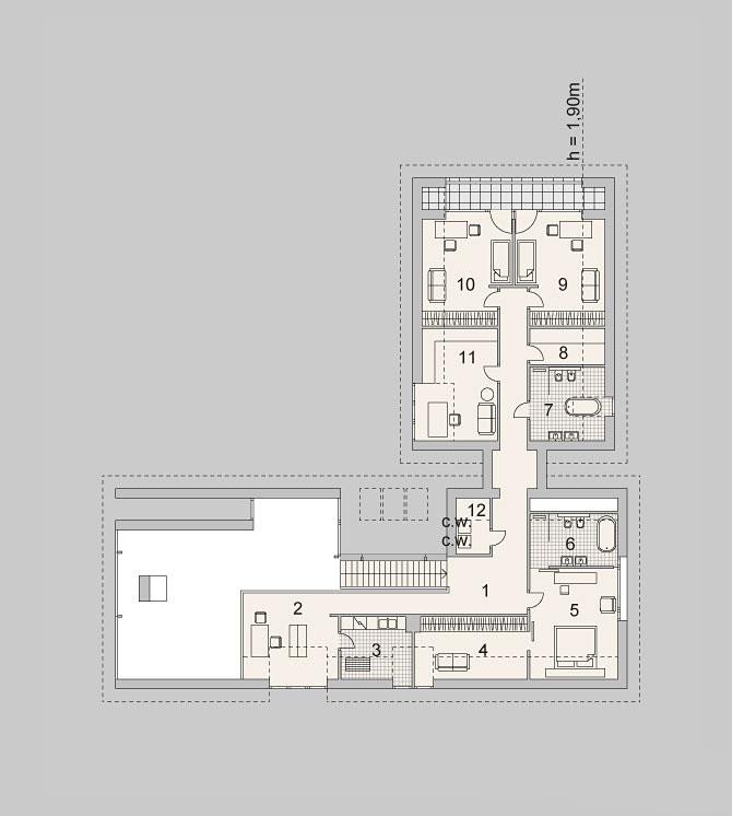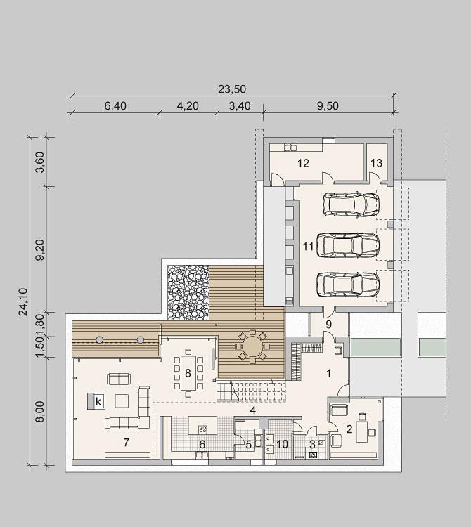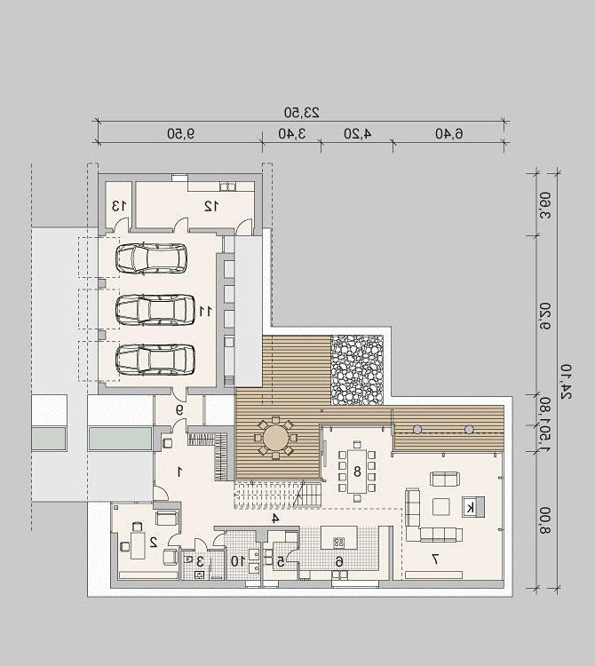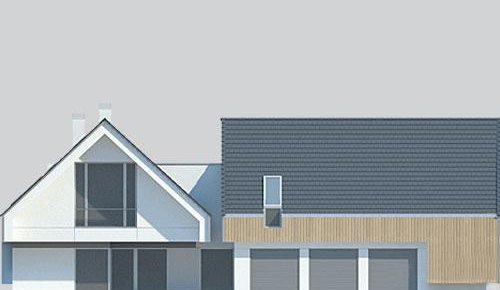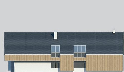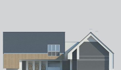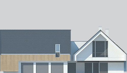 Projekt nowoczesnego domu z przestronnym garażem posiadającym trzy miejsca parkingowe. Idealny dla rodziny 4-6 osobowej. Posiada miejsce przeznaczone na biblioteczke, pracownie i garderobę.