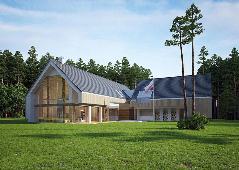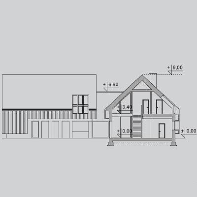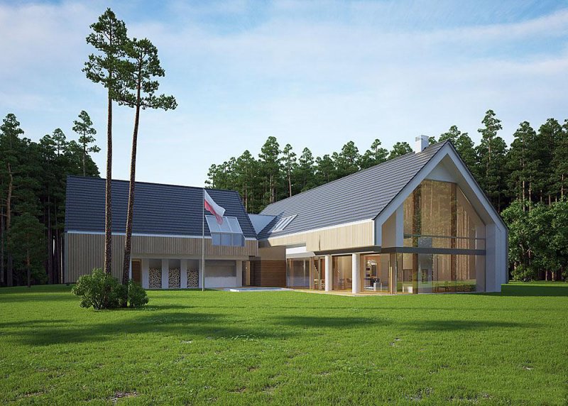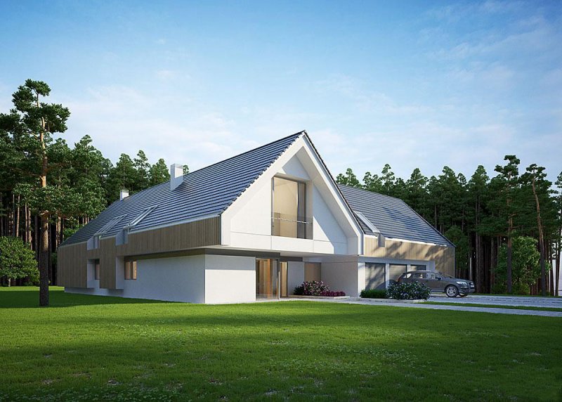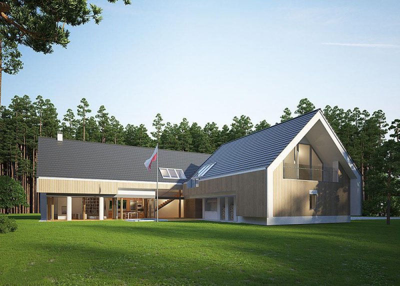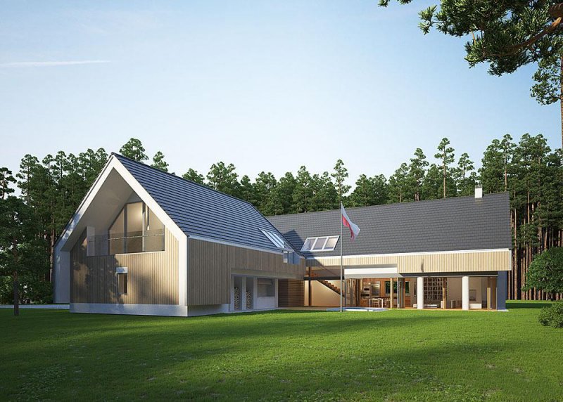 - Elewacje: wykończone tynkiem silikonowym, drewno na aluminiowej podkonstrukcji