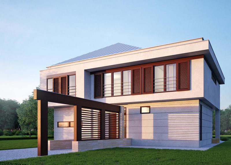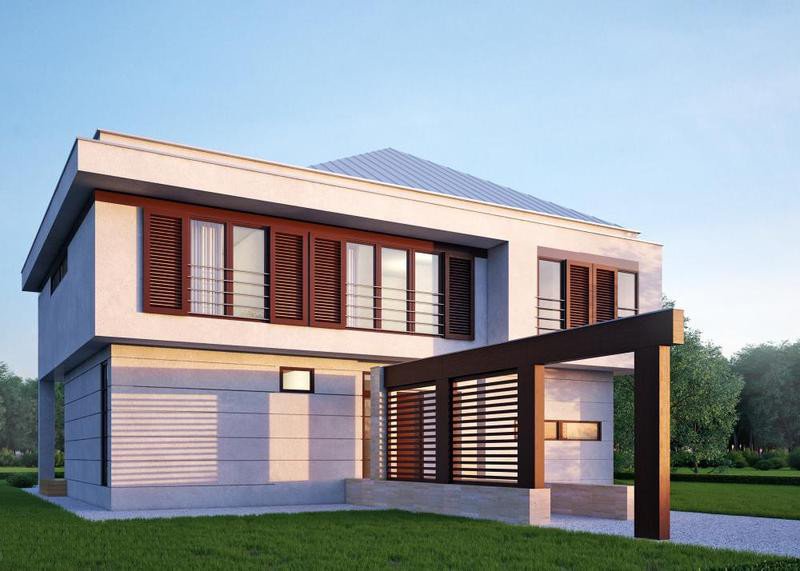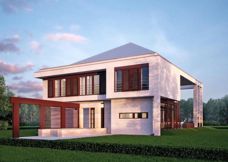 - Elewacje: tynk silikonowy kolor: biały, kamień: trawertyn, belki ozdobne: drewno klejone, egzotyczne kolor: mahoń
