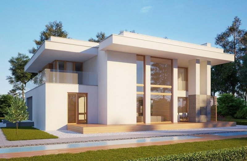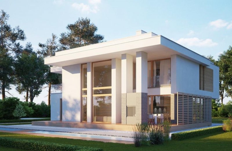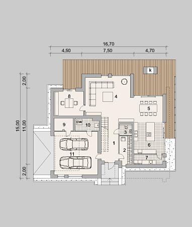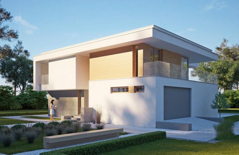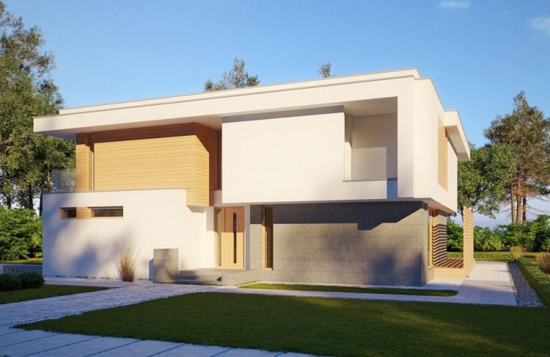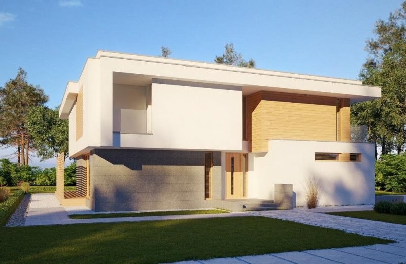 - Elewacje: tynk silikonowy kolor: biały/szary, płyty fasadowe HPL w okleinie drewnianej, kamień naturalny jasny granit