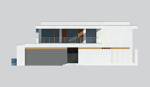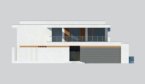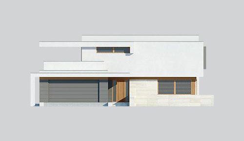 Projekt nowoczesnego domu piętrowego, który posiada pięknie oświetlony salon oraz garaż.
