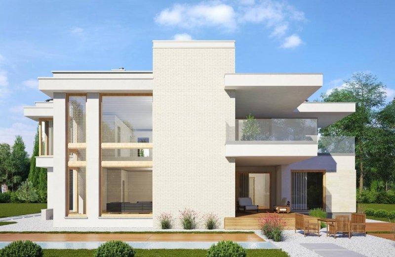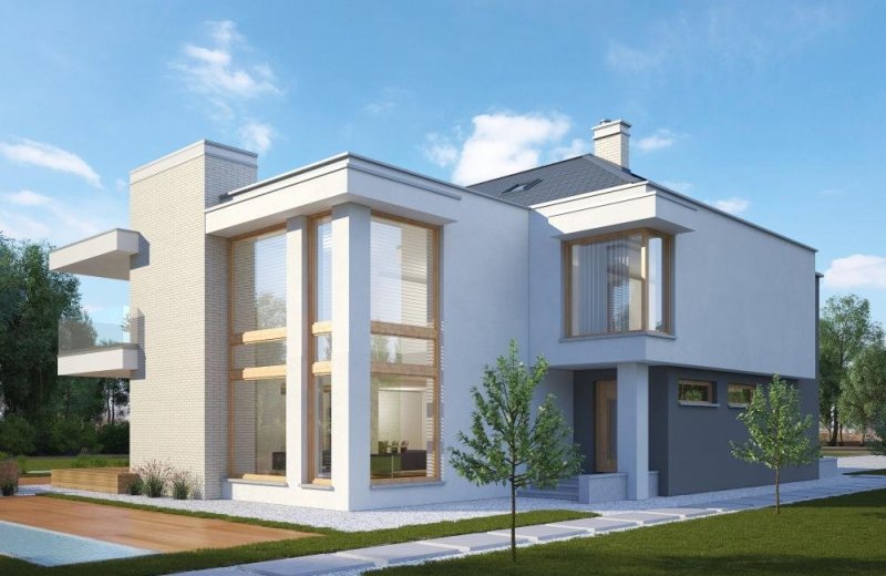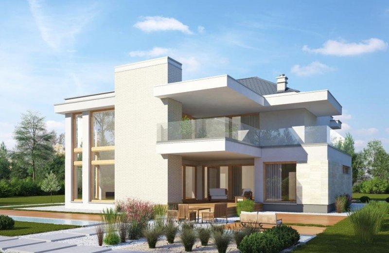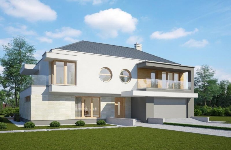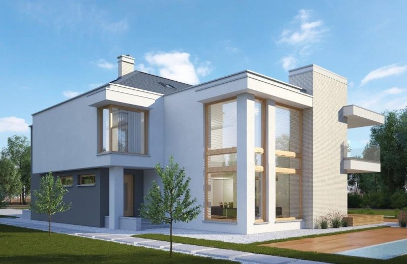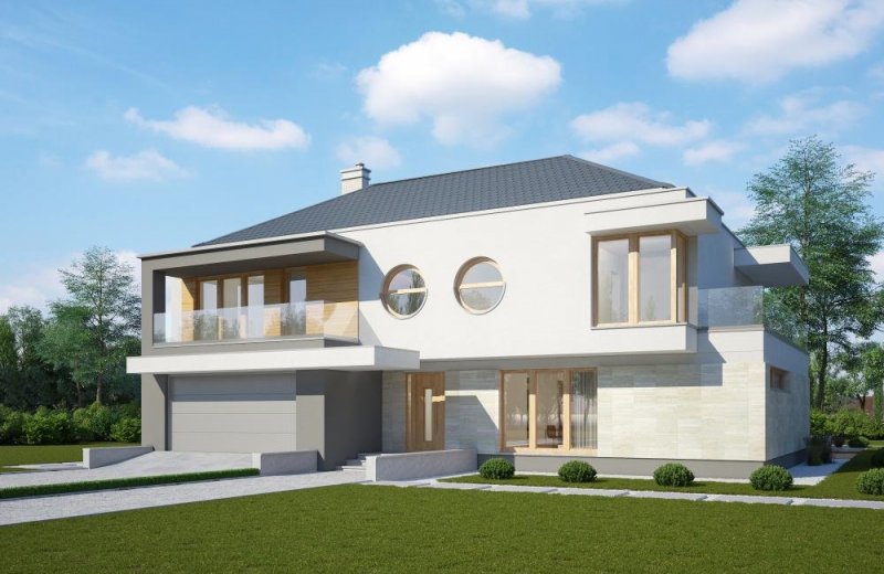 - Elewacje: tynk silikonowy, cegła ręcznie formowana, okładzina kamienna i drewniana