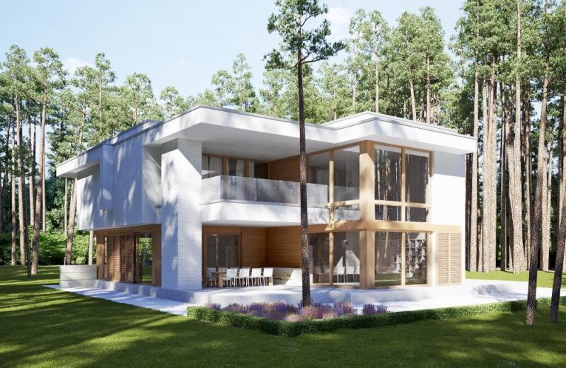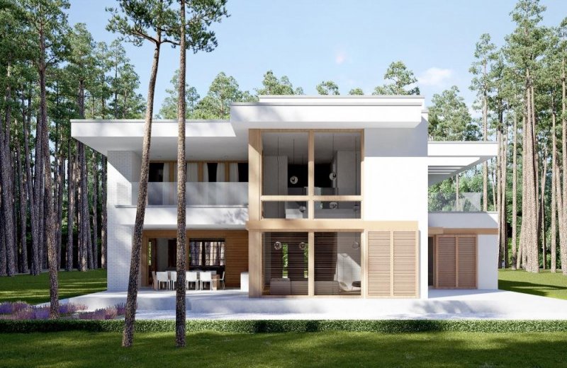 - Elewacje: okładzina drewniana, trawertyn jasnym, tynk silikonowy, cokól i taras kamień naturalny, cegła klinkierowa
