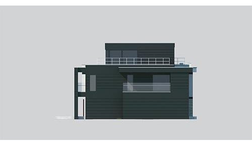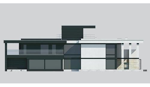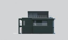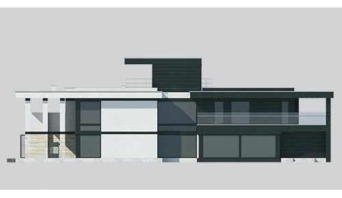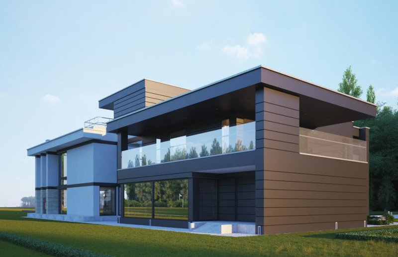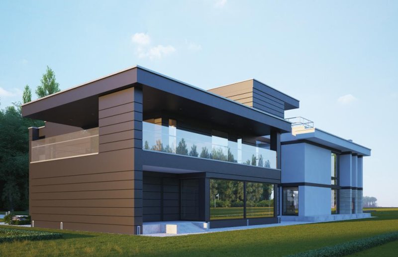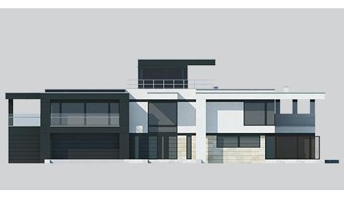 Elewacje: czarne płyty elewacyjne, kamień naturalny - trawertyn, tynk silikonowy w kolorze białym