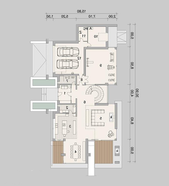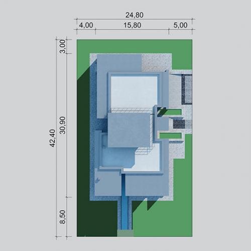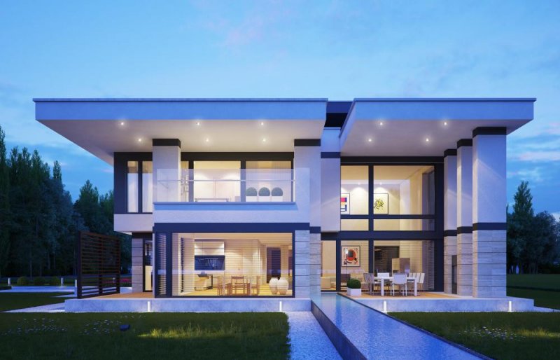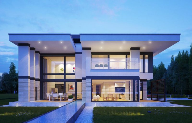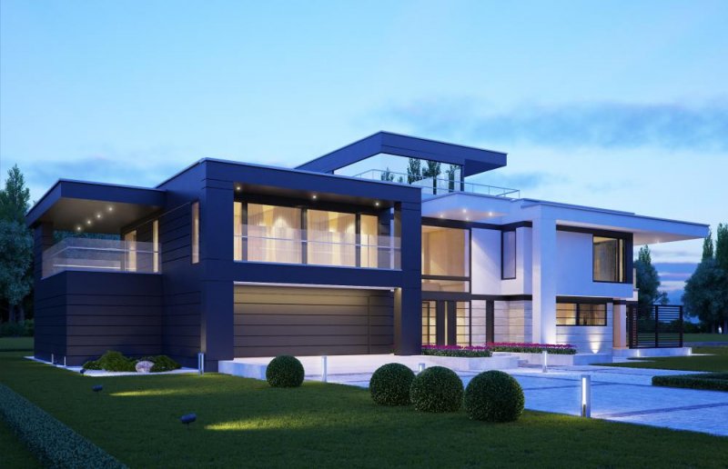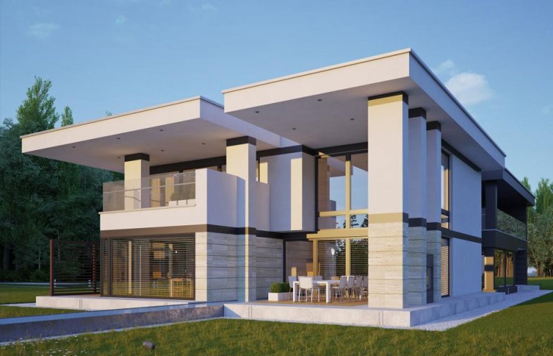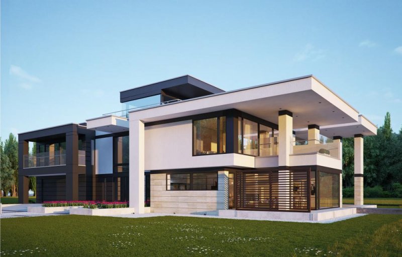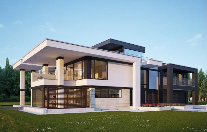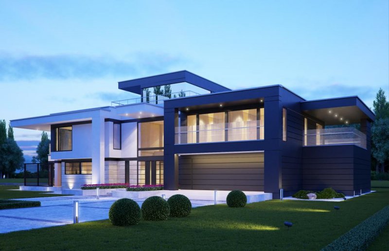 Nowoczesny, piętrowy dom z garażem dwustanowiskowym w bryle budynku.