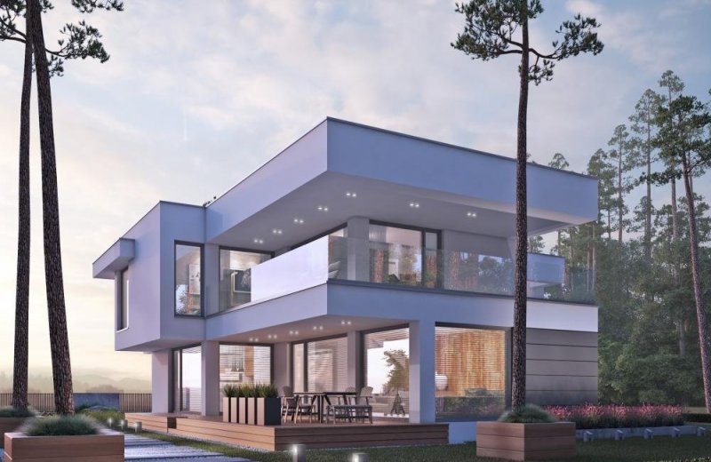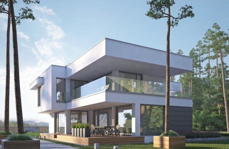 - Elewacje: płyty piaskowaca, tynk jasny silikonowy, cokół tynk silikonowy biały, taras kamień naturalny, deski tarasowe kompozytowe, balustrada całoszklana system firmy BALARDO