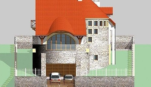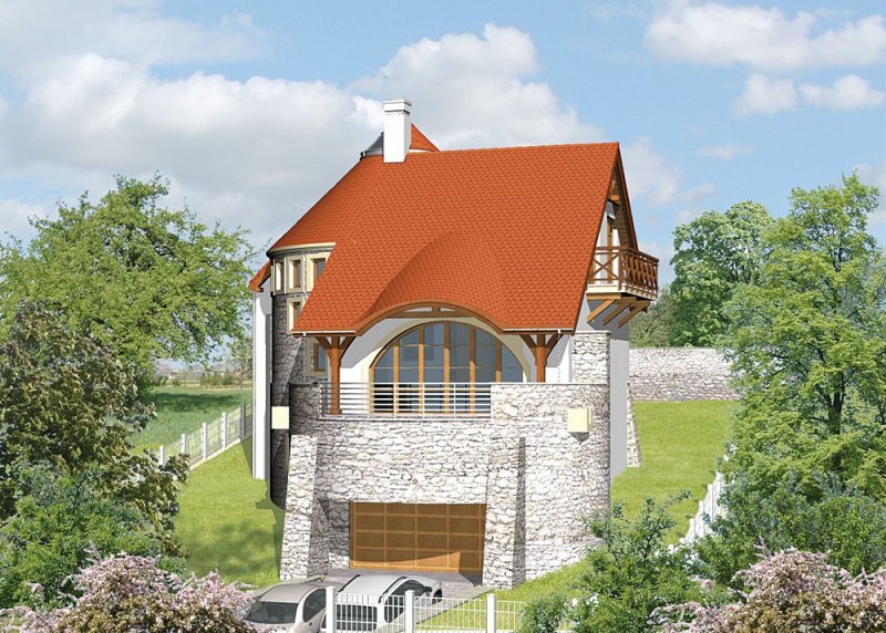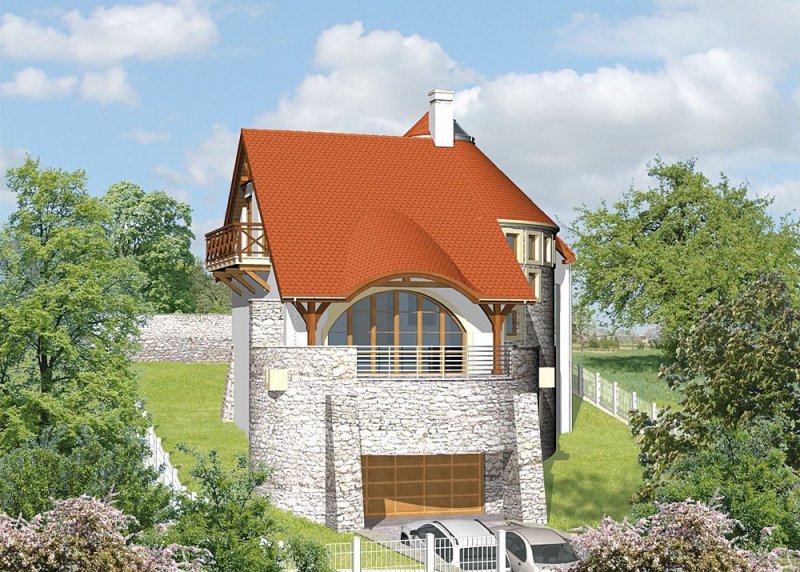 Dom jednorodzinny, parterowy, podpiwniczony z użytkowym poddaszem i dwustanowiskowym garażem.