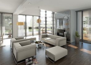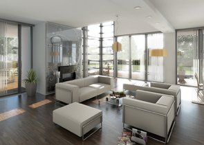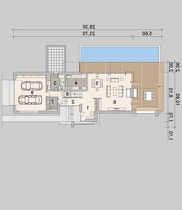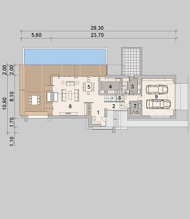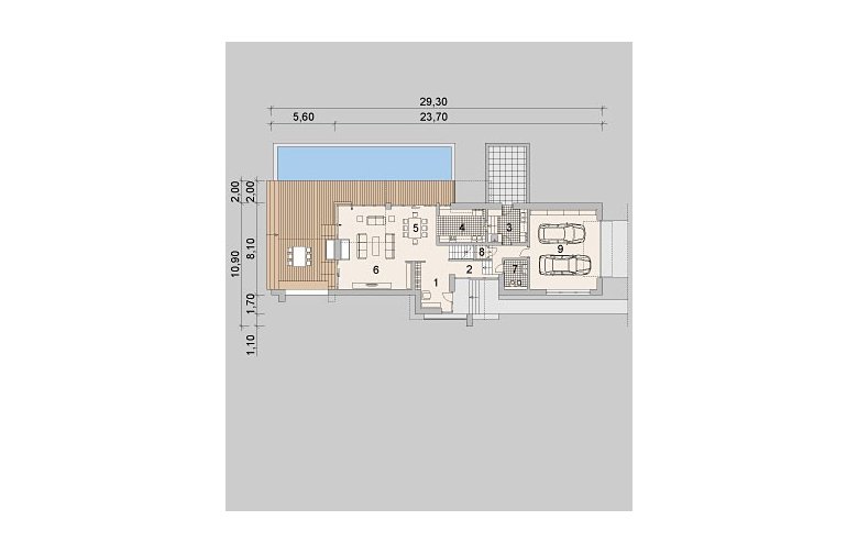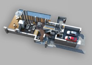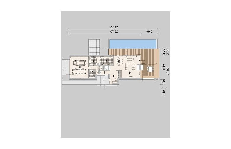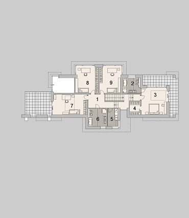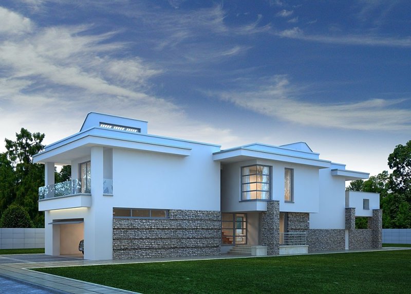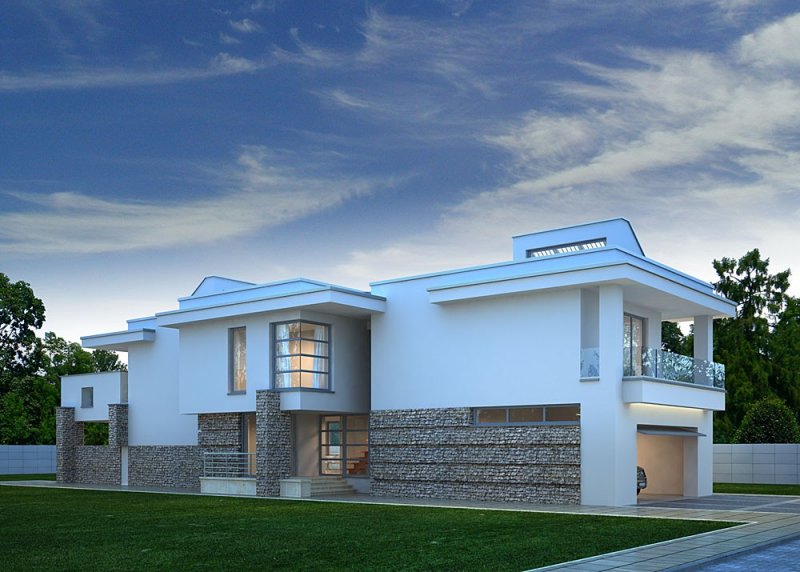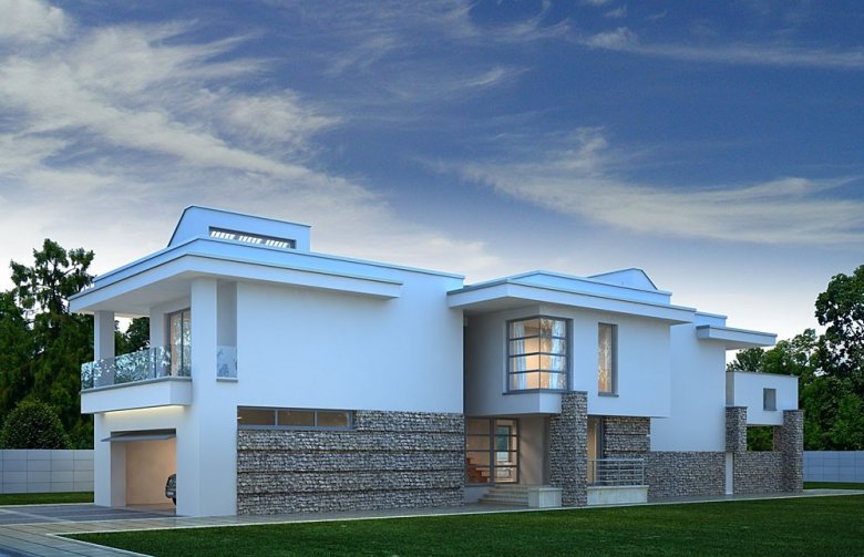 - Elewacje: wykończone tynkiem silikonowym i kładziną z piaskowca i panelami imitującymi drewno