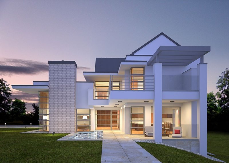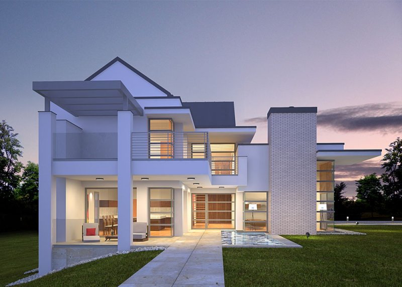 - Elewacje: wykończone tynkiem silikonowym, okładzina kamienna wapień