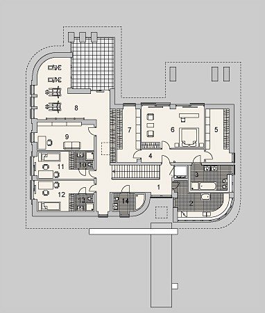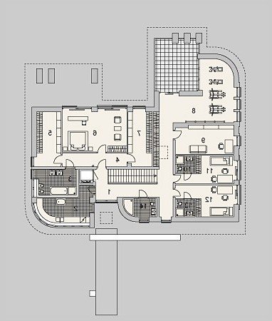 - Konstrukcja dachu: drewniana, ocieplona wełną mineralną firmy Rockwool gr. 30cm, konstrukcja stropodachu: system firmy Bauder :dwuwarstwowy układ z papami bitumicznymi na płycie żelbetowej z termoizolacja spadkową