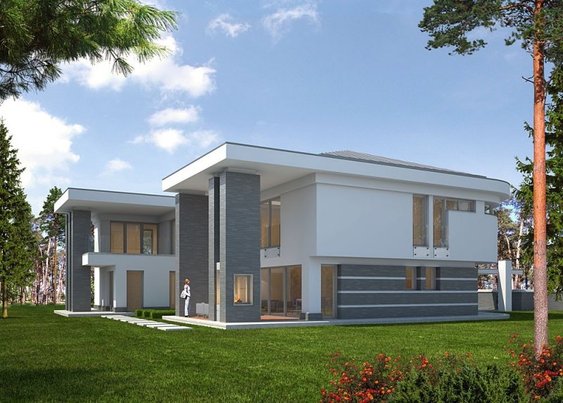 - Elewacje: wykończone tynkiem silikonowym, wapieniem ciętym, cegłą klinkierową Koramic firmy Winerberger