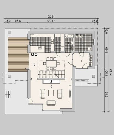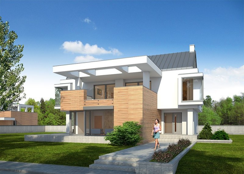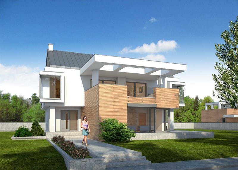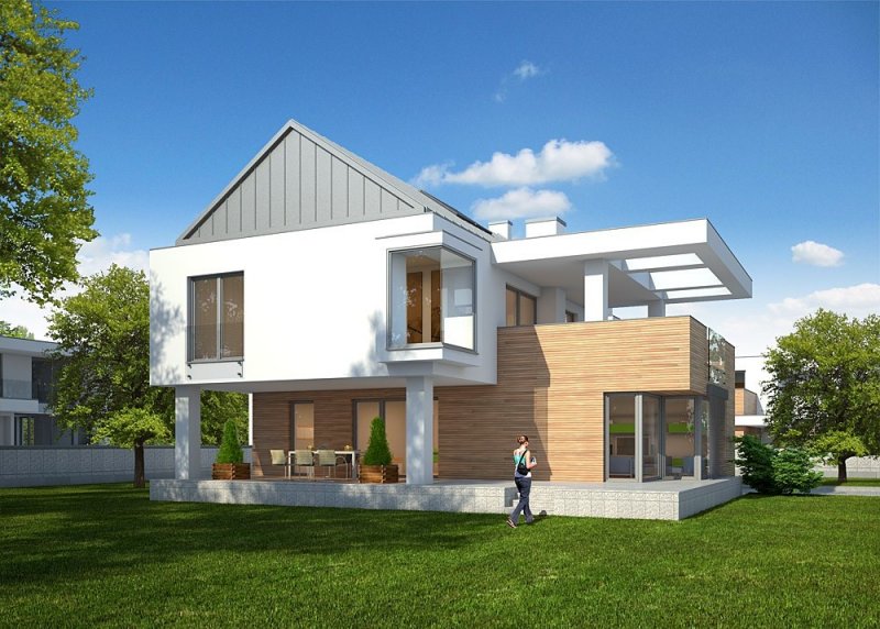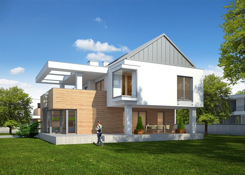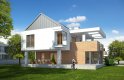 - Elewacje: wykończone tynkiem silikonowym,i elewacje drewniane Moco, cokół tarasów: jasny granit