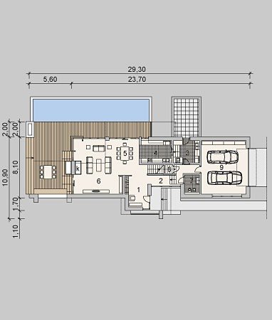 - Elewacje: wykończone tynkiem silikonowym, płytki elewacyjne Terca Stratus firmy Wienerberger, cegła klinkierowa Terca Stratus firmy Wienerberger