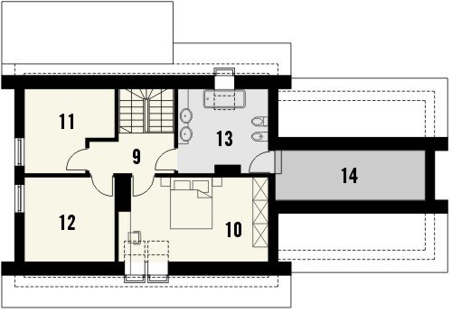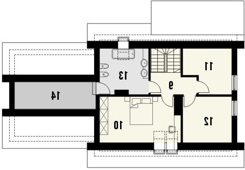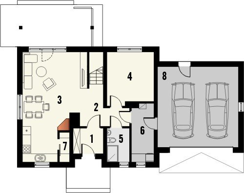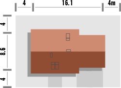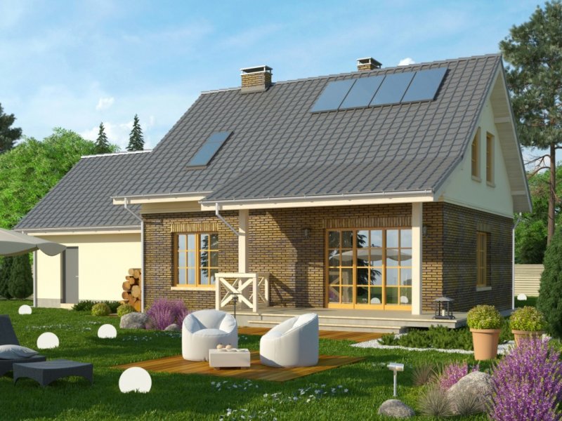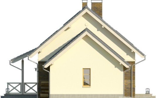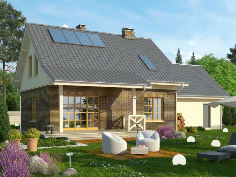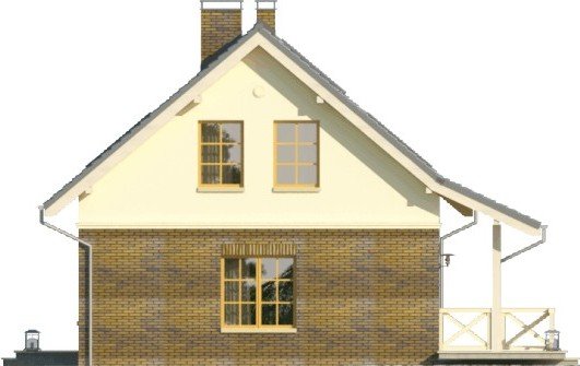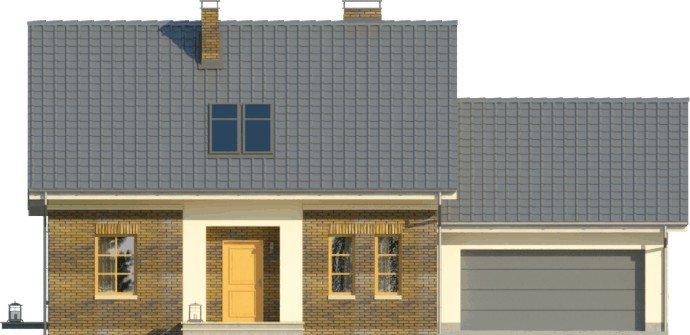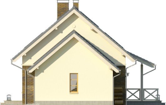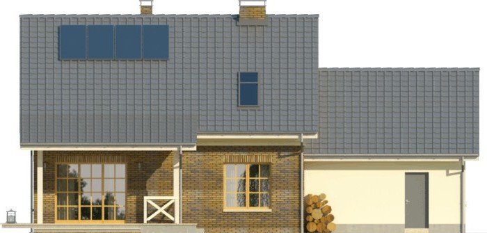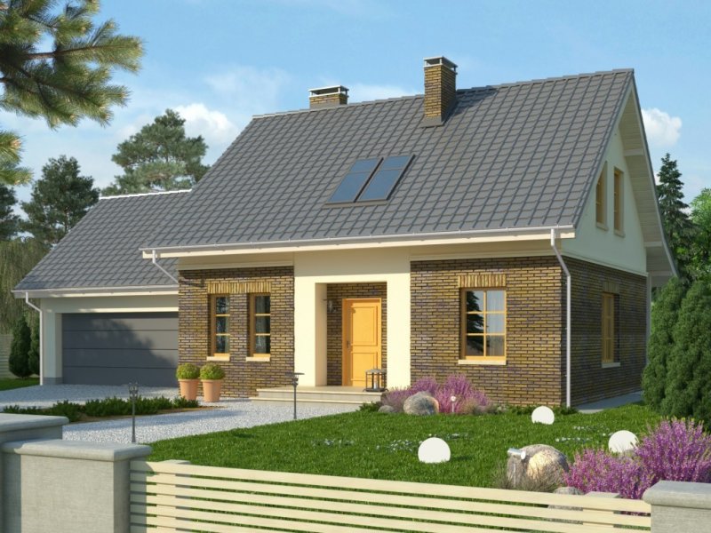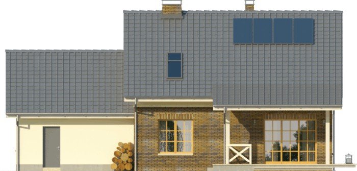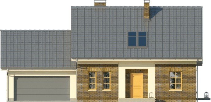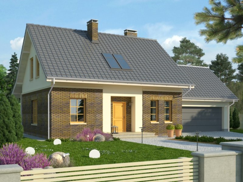 Projekt domu piętrowego z podwójnym garażem. Na parterze znajduje się przestronny pokój dzienny z otwartą kuchnią, dodatkowy pokój z widokiem na ogród, łazienka, pomieszczenie gospodarcze oraz wiatrołap z miejscem na szafę. Trzy sypialnie na poddaszu mają dostęp do wygodnej łazienki i strychu idealnego np. na suszarnię. Dokumentacja do nabycia także w odbiciu lustrzanym.Prosta bryła domu przykryta tanim dachem dwuspadowym. Uwagę zwraca płytka klinkierowa na części ścian parteru oraz na ścianie w strefie wejściowej. Duże okno prowadzące na taras doskonale doświetla salon.W projekcie przewidziano ściany z betonu komórkowego ocieplone styropianem. Strop jest gęstożebrowy typu Teriva, a więźba drewniana. Do pokrycia dachu można użyć dachówki cementowej albo ceramicznej. Elewacja może być w całości tynkowana, albo z elementami obłożonymi płytkami klinkierowymi jak pokazano na wizualizacjach. Materiały można dowolnie zmieniać podczas adaptacji.