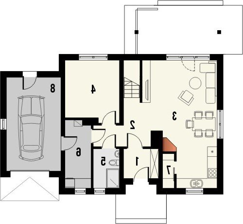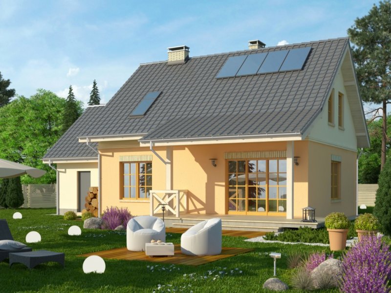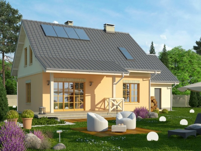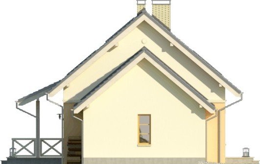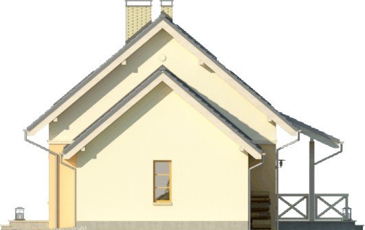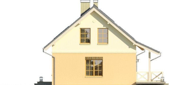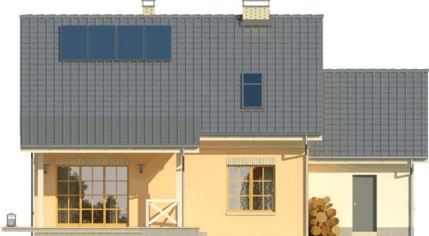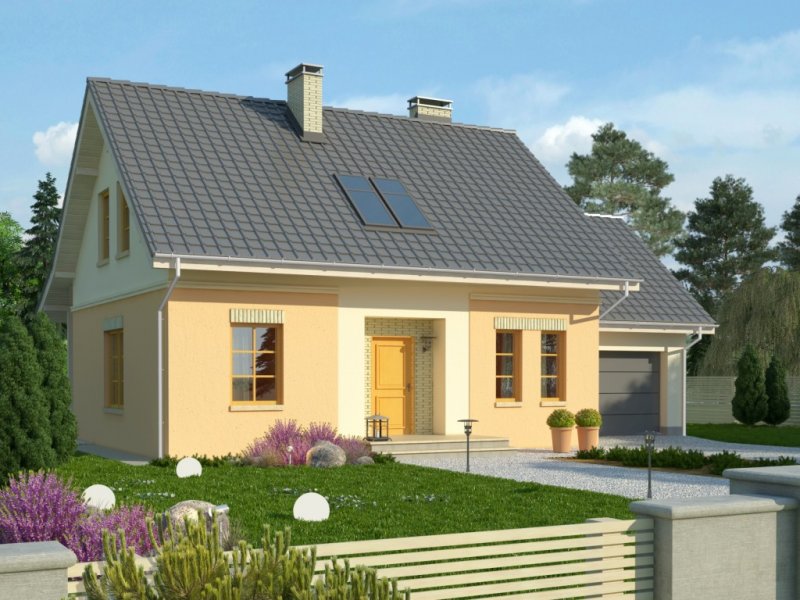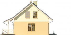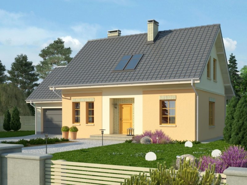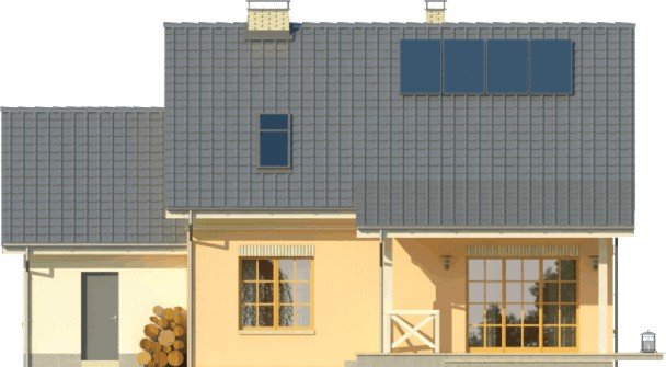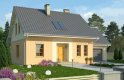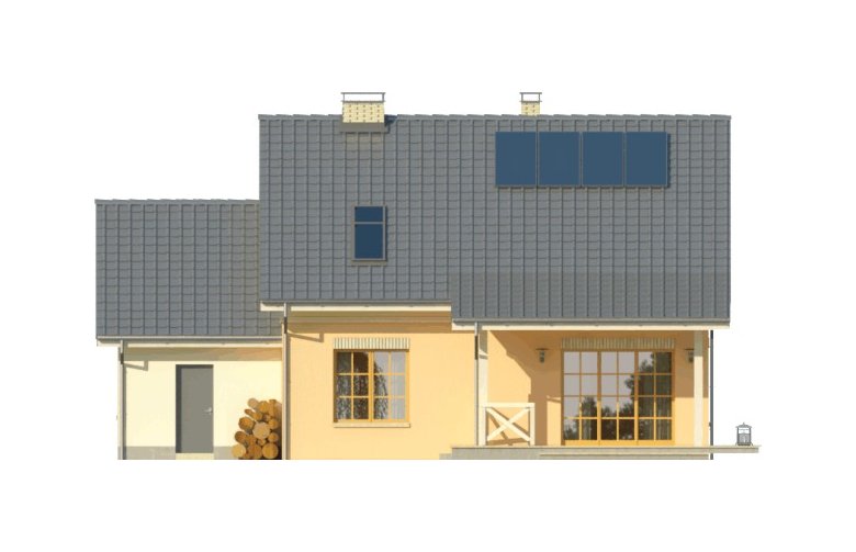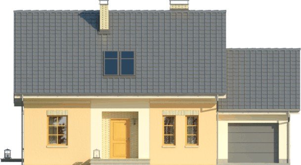 Dom jednorodzinny z poddaszem użytkowym, z garażem dostawionym z boku. Na parterze zaprojektowano otwartą strefę dzienną: salon z miejscem na duży stół i kuchnię ze spiżarnią, jak również dodatkowy pokój, łazienkę i pomieszczenie gospodarcze. Poddasze zajmują trzy sypialnie, duża łazienka i strych. Dokumentacja dostępna także w wersji lustrzanej.Tani w realizacji dom z dachem dwuspadowym. Charakterystycznymi elementami są obłożone klinkierem nadproża nadokienne oraz ozdobny gzyms międzypiętrowy.