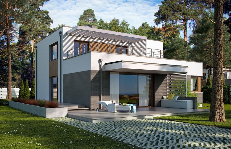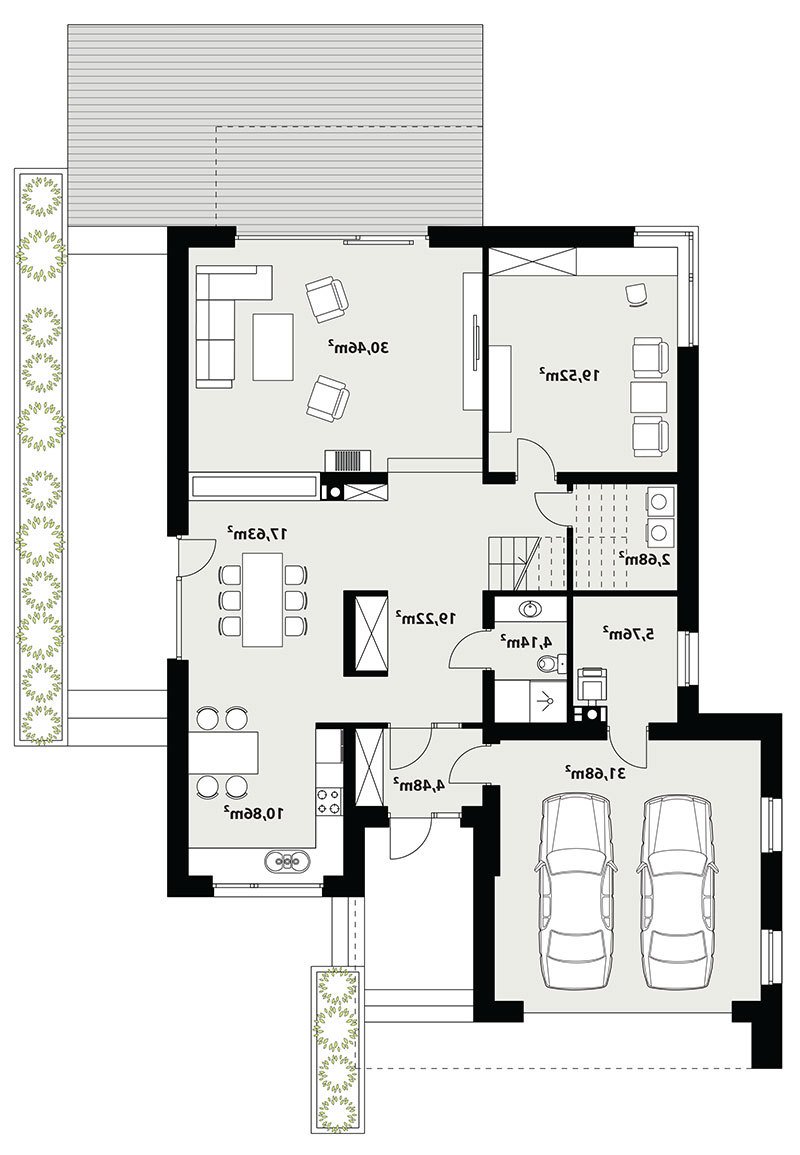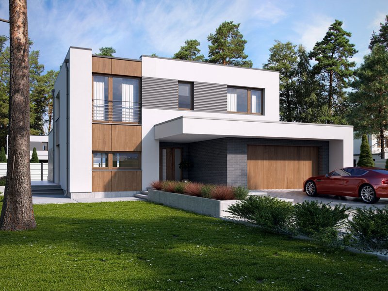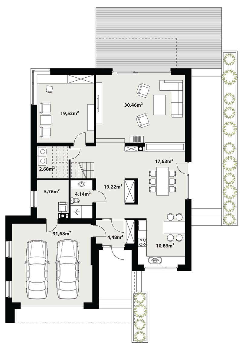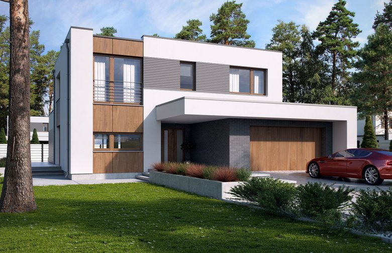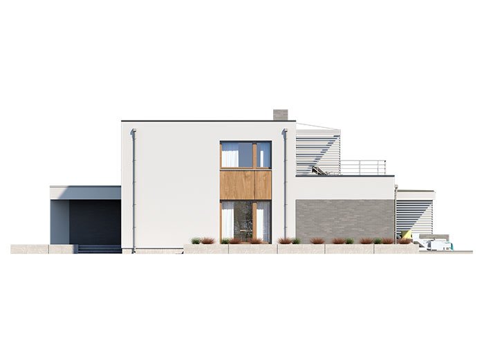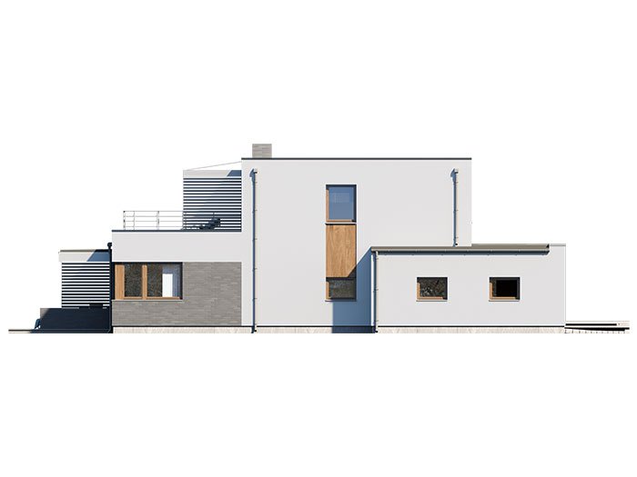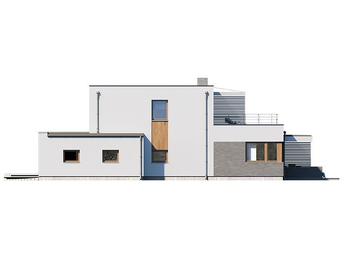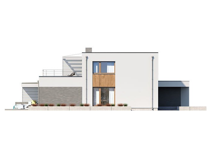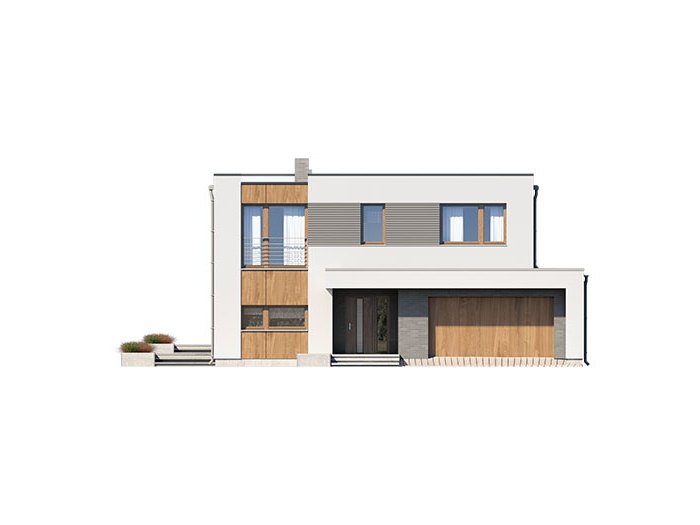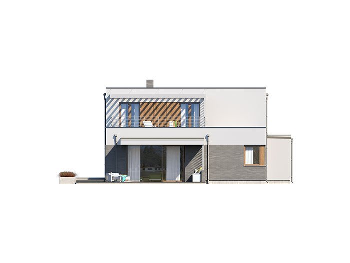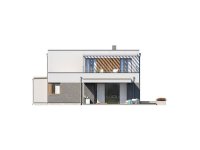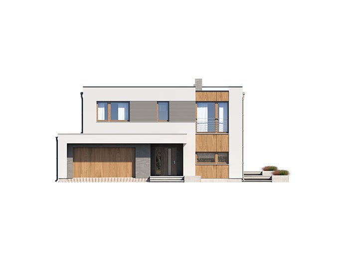 Nowoczesny, piętrowy dom jednorodzinny, z dwustanowiskowym garażem. Swoim pełnym programem funkcjonalnym zapewnia komfort i wygodę 4-5-osobowej rodzinie. Przestronną część dzienną tworzy wysoki salon z wyjściem na zadaszony taras, jadalnia, kuchnia. W części dziennej zaprojektowano również duży gabinet, łazienkę i pomieszczenie gospodarcze. Część nocna to 3 wygodne sypialnie, łazienka oraz garderoba. Na piętrze, z sypialni i holu dostępny jest taras nad salonem. W domu zaprojektowano dużą kotłownię dostępną z garażu, której parametry pozwalają na montaż kotła na każdy rodzaj paliwa, w tym na paliwo stałe. Ten optymalny i ciekawy program funkcjonalny został ujęty w prostej bryle przykrytej płaskim dachem.