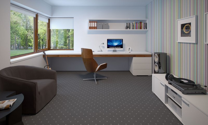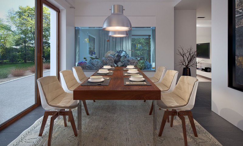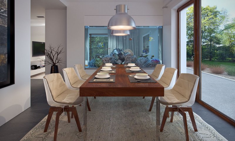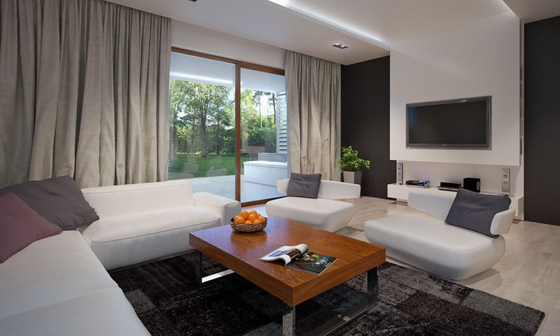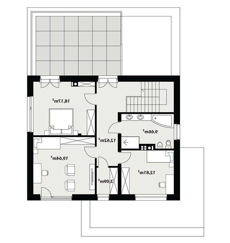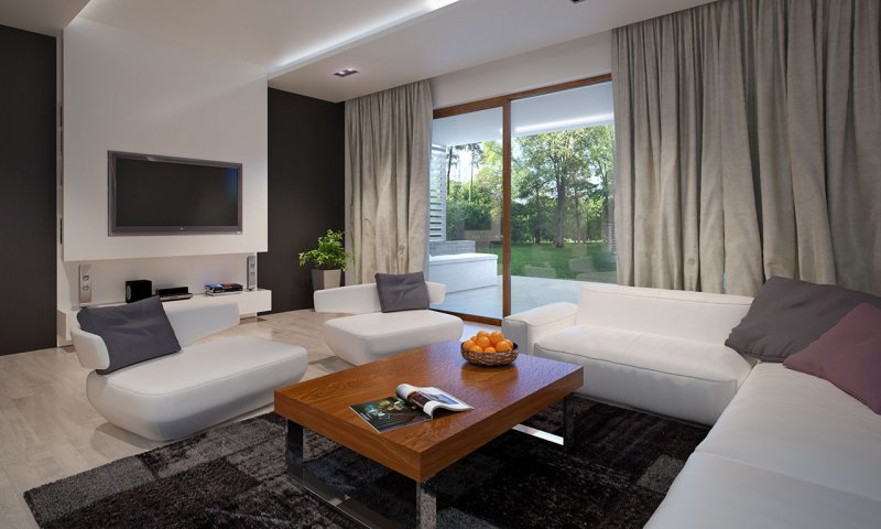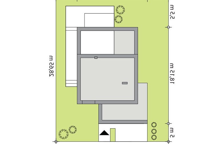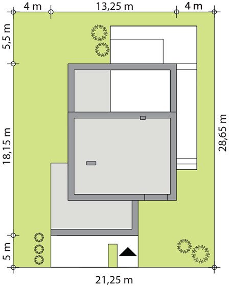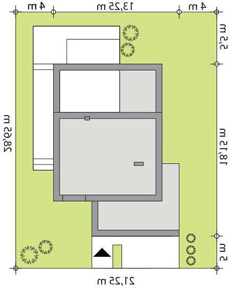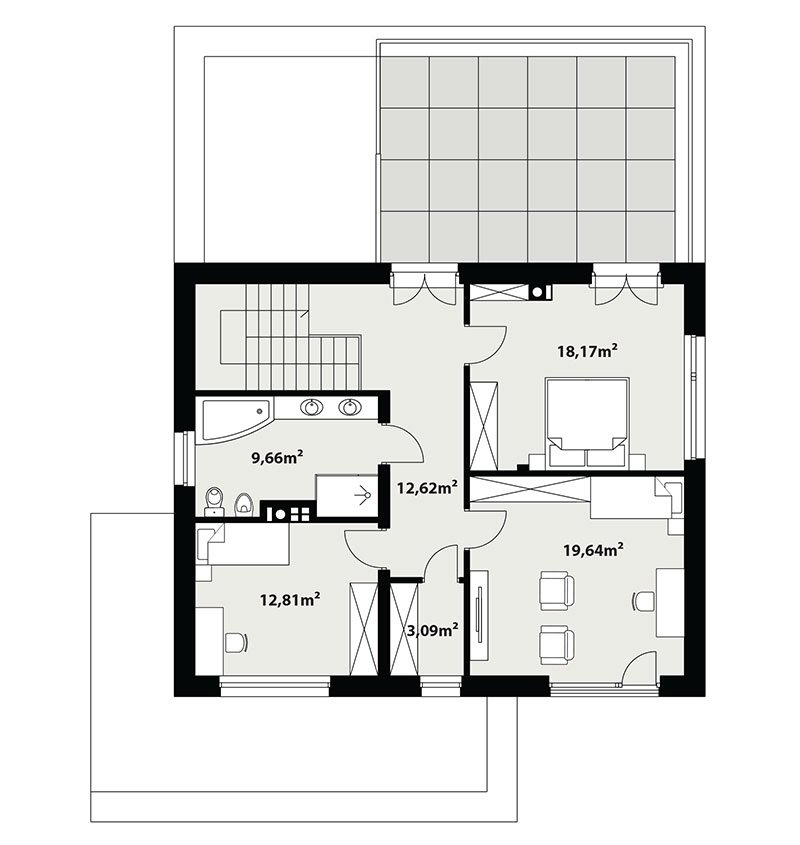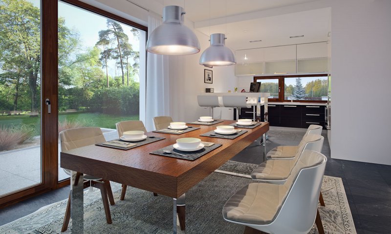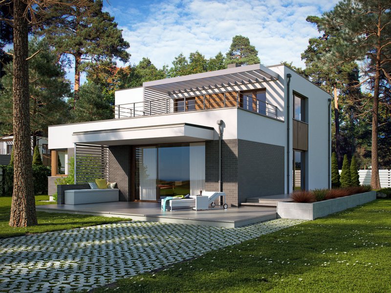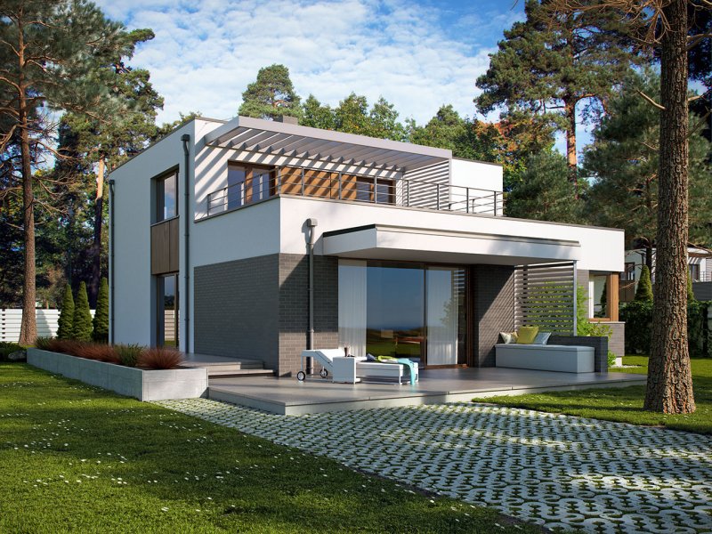 Nowoczesny, piętrowy dom jednorodzinny, z dwustanowiskowym garażem. Swoim pełnym programem funkcjonalnym zapewnia komfort i wygodę 4-5-osobowej rodzinie. Przestronną część dzienną tworzy wysoki salon z wyjściem na zadaszony taras, jadalnia, kuchnia. W części dziennej zaprojektowano również duży gabinet, łazienkę i pomieszczenie gospodarcze. Część nocna to 3 wygodne sypialnie, łazienka oraz garderoba. Na piętrze, z sypialni i holu dostępny jest taras nad salonem. W domu zaprojektowano dużą kotłownię dostępną z garażu, której parametry pozwalają na montaż kotła na każdy rodzaj paliwa, w tym na paliwo stałe. Ten optymalny i ciekawy program funkcjonalny został ujęty w prostej bryle przykrytej płaskim dachem.