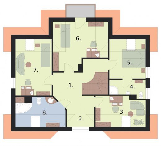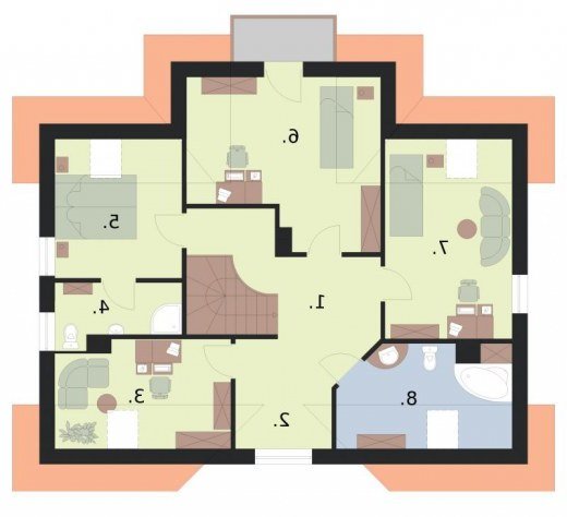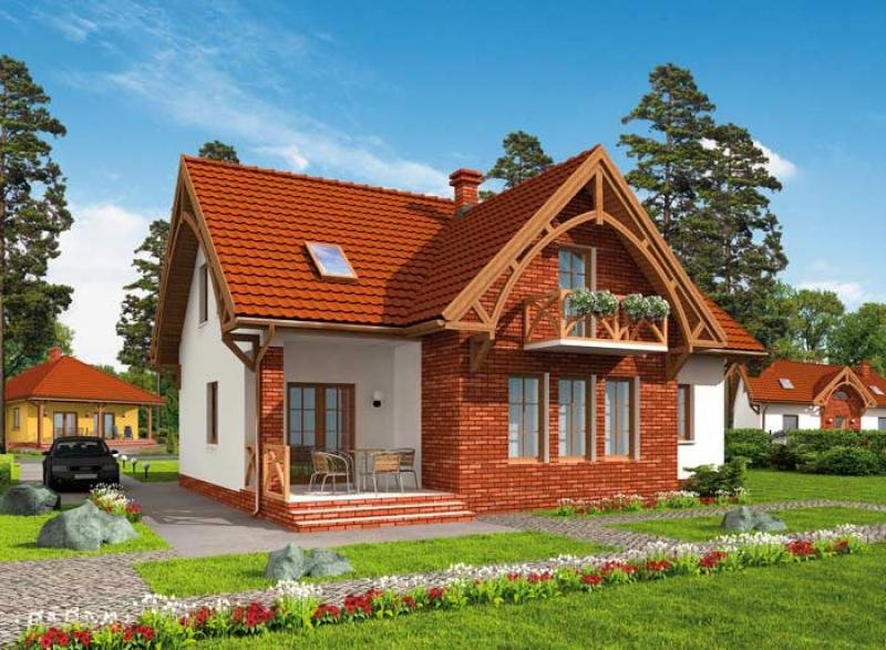 "MIRAMAS 2" dom jednorodzinny z poddaszem użytkowym. Prostota i gustowne wykończenia oraz praktyczne i estetyczneto pary wyrazów, które świetnie opisują Miramas 2. Drzwi główne zostały umieszczone w centralnej części elewacji frontowej – nad nimi wznosi się niewielki daszek stanowiący niewielki pseudoryzalit stworzony po to, by dodać uroku wejściu do domu. Schody wejściowe zostały otoczone uroczymi murkami. Elewacja tylna natomiast została tak pomyślana, by obszerny ryzalit, tworzący wewnątrz dodatkową przestrzeń dla pokoju dziennego, osłaniał przylegający do ściany północnej i wschodniej, uroczy taras. Budynek nie jest podpiwniczony, ale posiada możliwość adaptacji kotłowni na węgiel. W tym projekcie przewidziano kilka mniejszych pomieszczeń, które spełniają bardzo ważne funkcje i pomogą utrzymać porządek w domu. Wchodząc do środka, przechodzimy przez wiatrołap, by dojść do komunikacji. Na lewo mamy wejście do kotłowni połączonej z pomieszczeniem technicznym. Do ściany zachodniej domu przylega także niewielka łazienka, w której znajdzie się miejsce na kabinę prysznicową. Obok niej mamy pomieszczenie, w którym możemy urządzić na przykład pokój telewizyjny czy bibliotekę. Do ściany północnej domu przylega pokój dzienny, który zachwyca trzema obszernymi oknami. Na prawo od wiatrołapu znajduje się półotwarta kuchnia posiadająca przejście do spiżarni. Niewątpliwie czarującym miejscem domu będzie jadalnia – po pierwsze dlatego, że jej okna wychodzą na wschód, a po drugie – można z niej wyjść na taras. Taki układ pomieszczeń będzie bardzo wygodnym rozwiązaniem, jeżeli zdecydujemy się na przyjęcie na świeżym powietrzu. Schody na poddasze zostały umieszczone w centralnej części domu. Na piętrze mamy obszerną łazienkę wyposażoną w dużą wannę, do której światło wpada jedynie przez okno połaciowe, co zwiększa możliwości zagospodarowania przestrzeni w tym pomieszczeniu. Obok łazienki znajduje się pomieszczenie rekreacyjne, sąsiadujące z gabinetem. Do ściany wschodniej przylega także sypialnia posiadająca dostęp do odrębnej łazienki z prysznicem. Oprócz tych pomieszczeń, mamy tutaj jeszcze dwa pokoje – jeden, umieszczony w ryzalicie z wyjściem na balkon, drugi – przylegający do zachodniej ściany domu. Projekt Miramas 2 jest niezwykle interesujący, posiada wiele praktycznych, nietuzinkowych rozwiązań. Spełni oczekiwania najbardziej wymagających osób, poszukujących jednocześnie ekonomicznych rozwiązań. Przygotowaliśmy dla tego projektu kosztorys montażu systemu rekuperacji. Projekt składa się z części architektonicznej, konstrukcyjnej, wewnętrznych instalacji wod.-kan, c. o. i elektrycznej. W projekcie załączone są podstawowe zestawienie stali, drewna i stolarki okienno-drzwiowej. Do projektu dołączamy bezpłatną zgodę na wprowadzenie zmian, oświadczenie projektantów o wykonaniu projektu zgodnie z obowiązującymi normami i przepisami oraz kserokopie uprawnień projektantów wraz z aktualnym wpisem do izby. W przypadku zamówienia projektu w technologii lekkiej, drewnianej konstrukcji szkieletowej, powierzchnia użytkowa budynku jest o około 7% większa.