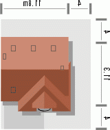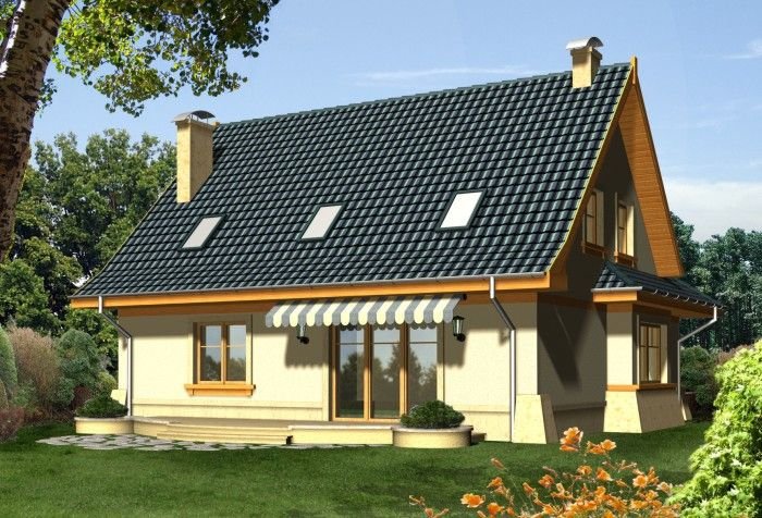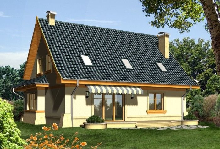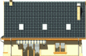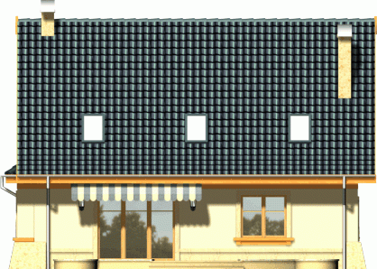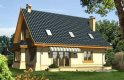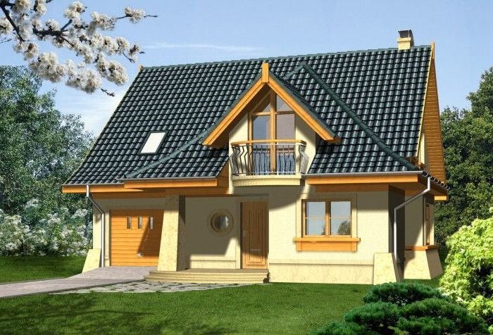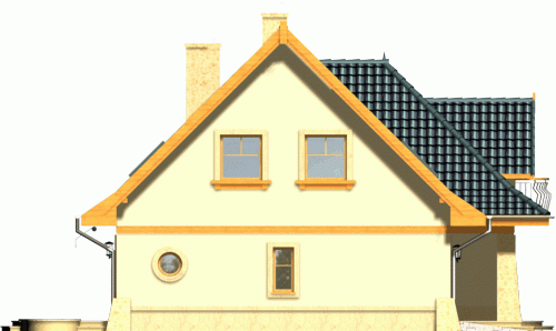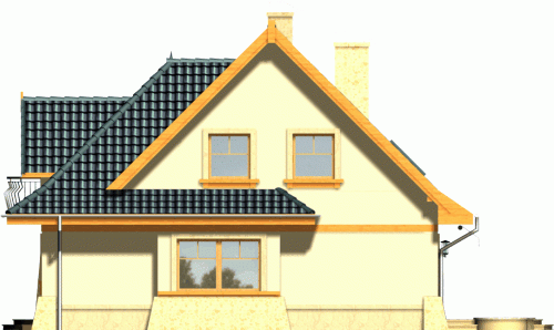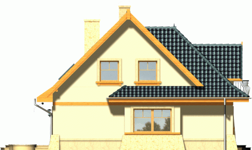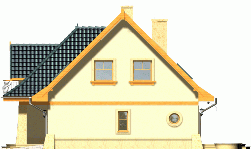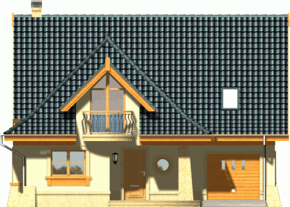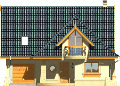 Klasyczny dom z dachem wielospadowym z zaznaczonym wejściem z podcienia. Dom wyróżnia się charakterystyczną lukarną z wyjściem na balkon od fronty budynku i potrójnym przeszkleniem od strony ogrodu.