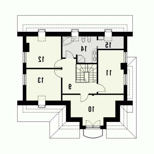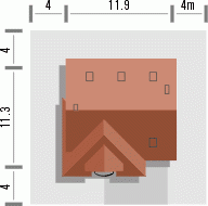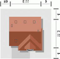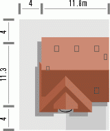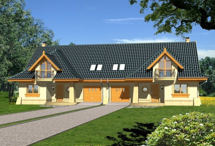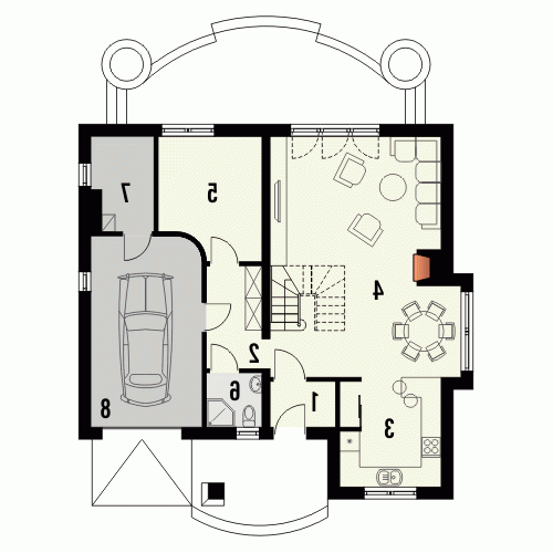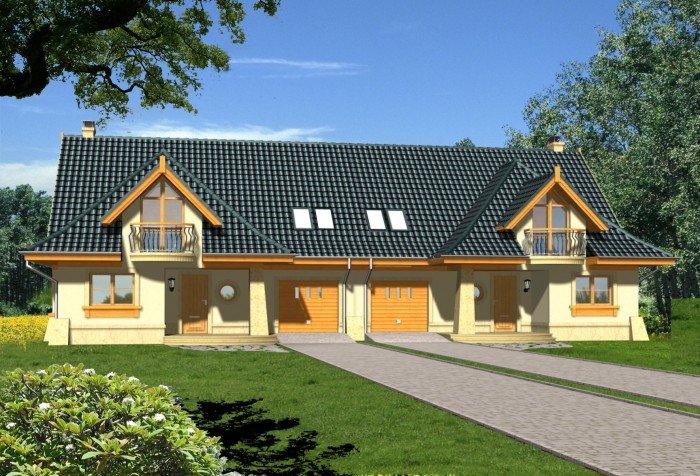 Budynek niepodpiwniczony piętrowy z garażem. Na parterze zaprojektowano pokój dzienny, kuchnię ze spiżarką, dodatkowy pokój z łazienką i pomieszczenie gospodarcze. Na poddaszu znajdują się cztery pokoje oraz łazienka z pralnią. Dokumentacja również w odbiciu lustrzanym.