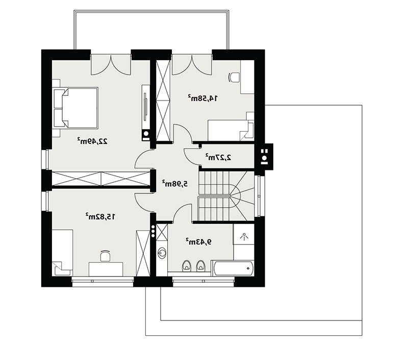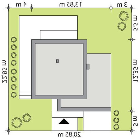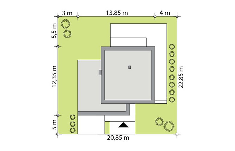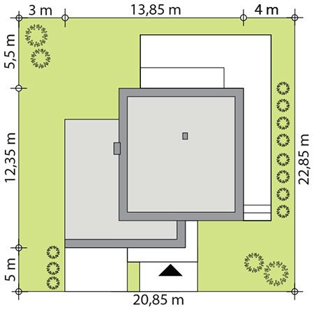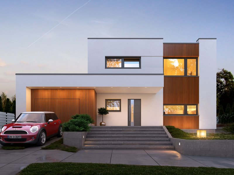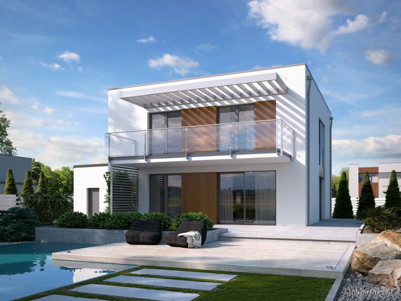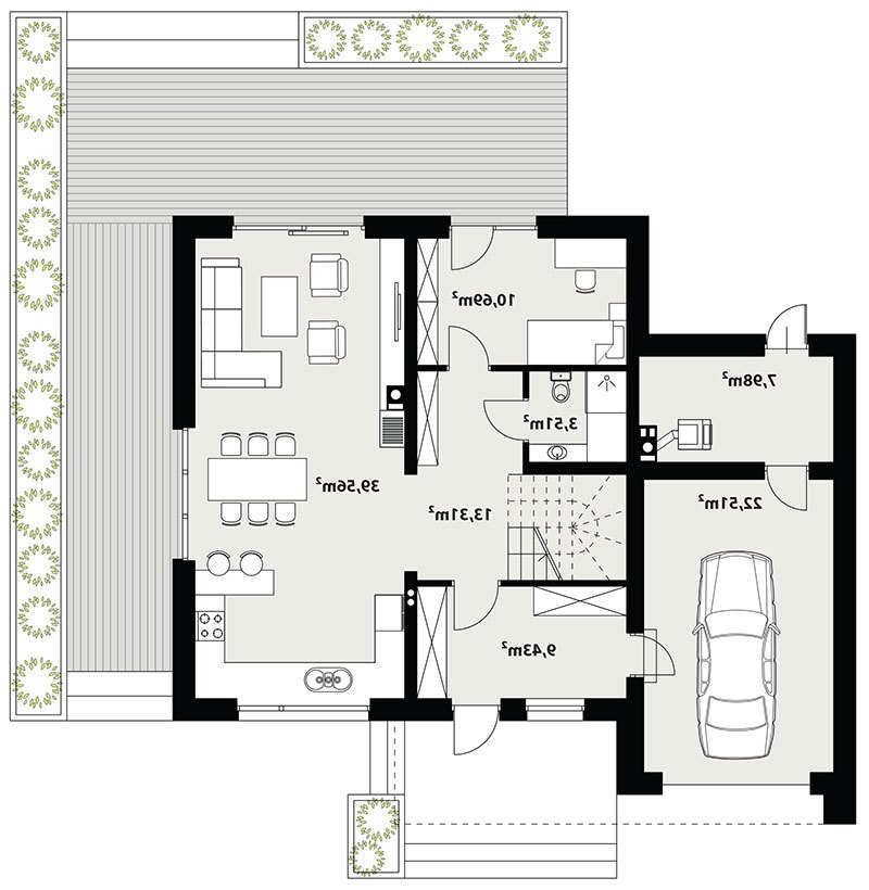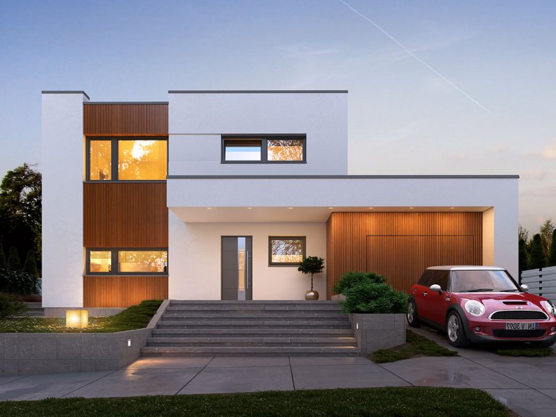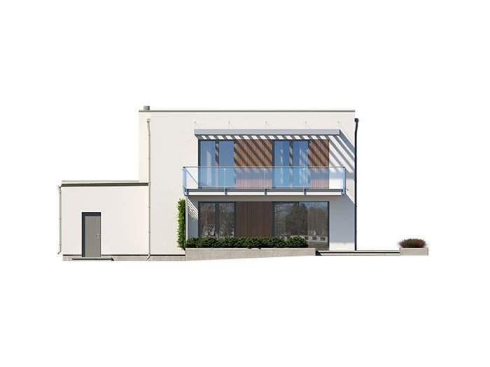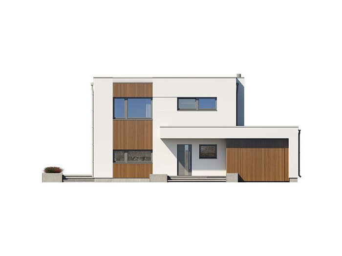 Nowoczesny, piętrowy dom jednorodzinny, z jednostanowiskowym garażem. Swoim pełnym programem funkcjonalnym zapewnia komfort i wygodę 4-5-osobowej rodzinie. Przestronną część dzienną tworzy wysoki salon z wyjściem na zadaszony taras, jadalnia, kuchnia. W części dziennej zaprojektowano również gabinet oraz łazienkę z prysznicem. Część nocna to 3 wygodne sypialnie, łazienka oraz garderoba. W domu zaprojektowano dużą kotłownię dostępną z garażu, której parametry pozwalają na montaż kotła na każdy rodzaj paliwa, w tym na paliwo stałe. Ten optymalny i ciekawy program funkcjonalny został ujęty w prostej bryle przykrytej płaskim dachem.