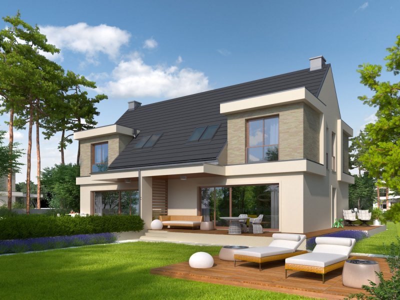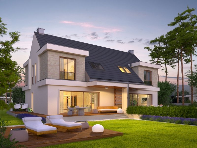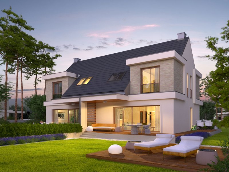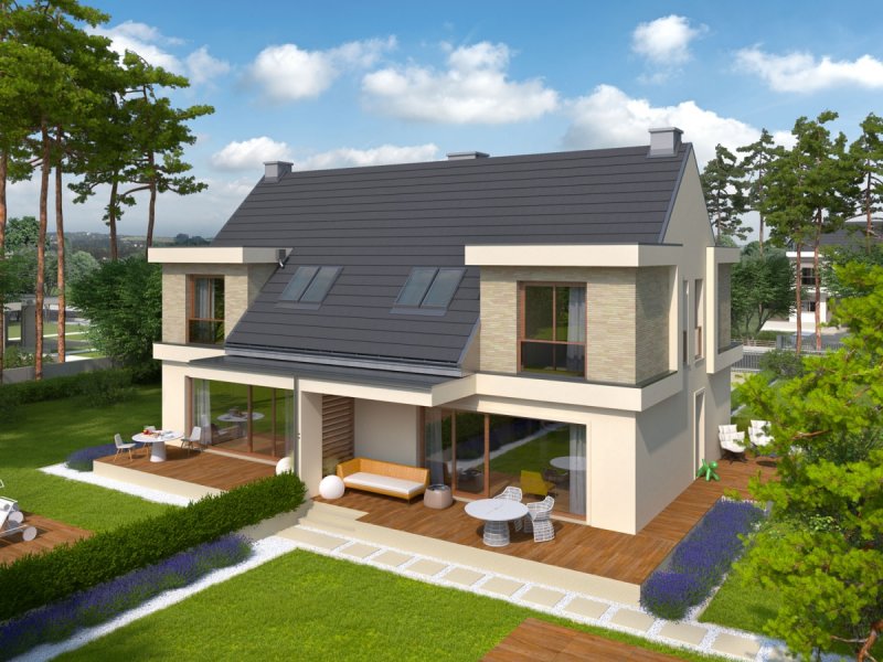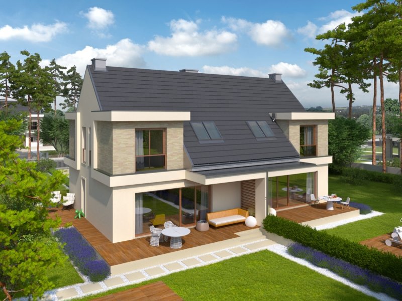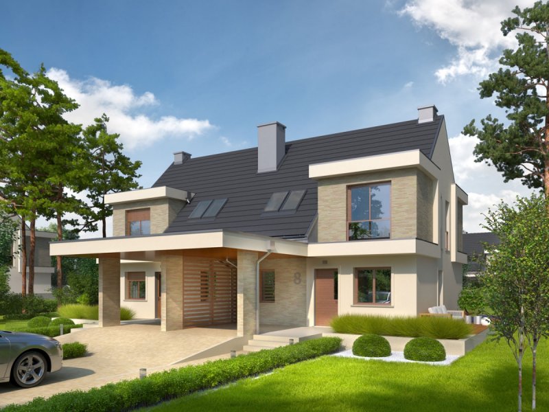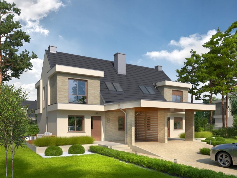 Dom Oliwier z wiatą (dwulokalowy) to doskonała propozycja dla dwóch rodzin lub rodziny wielopokoleniowej, która szuka ekonomicznej alternatywy do mieszkania. Dużym atutem projektu jest optymalnie rozplanowany układ funkcjonalny, który zapewnia mieszkańcom codzienny komfort użytkowy, niezależność oraz niezbędne poczucie prywatności.