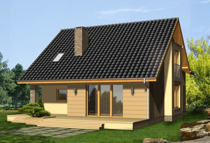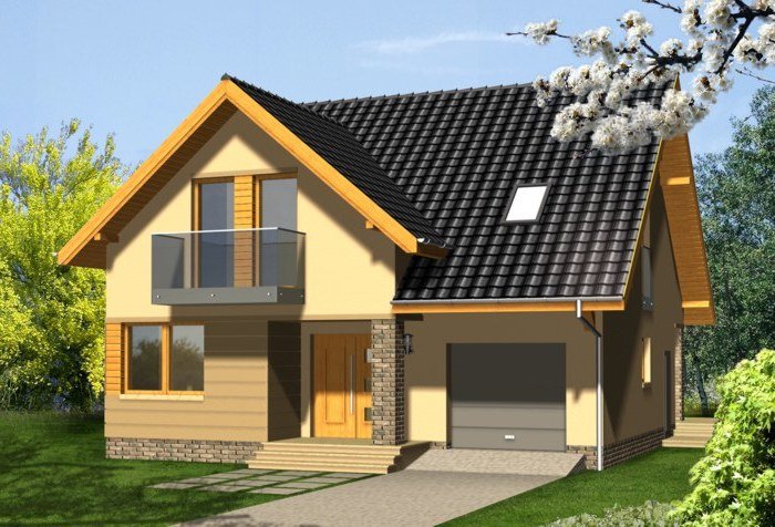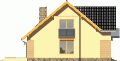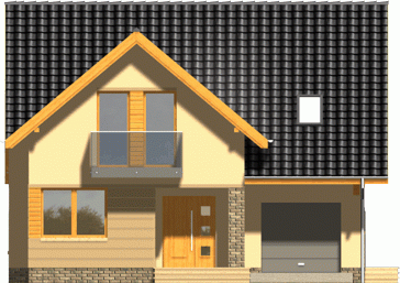 Nowoczesny w detalu dom z dachem dwuspadowym i reprezentacyjnym szczytem od frontu, dodatkowo ozdobionym balkonem ze szklaną balustradą. Całość uzupełniają podkreślone ciemniejszym boniowaniem fragmenty ścian parteru widoczne zarówno w strefie wejściowej, jak i przy oknach balkonowych od strony ogrodu.