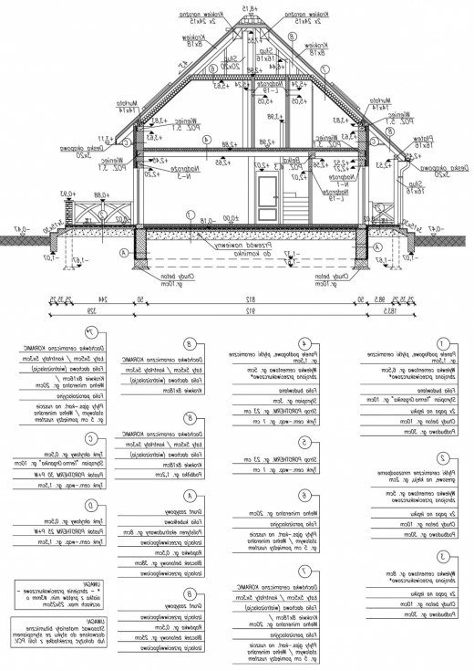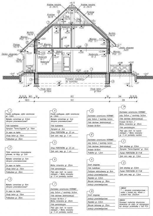 Technologia tradycyjna, ściany zewnętrzne murowane grubości 30 cm + 10 cm styropian, ściany wewnętrzne (nośne) gr. 25 cm i działowe gr. 12 cm. Wszystkie ściany wykonane z pustaków ceramicznych "POROTHERM". Strop gęstożebrowy "POROTHERM" o gr. 23 cm.. Konstrukcja więźby dachowej drewniana, pokrycie dachówka ceramiczna.