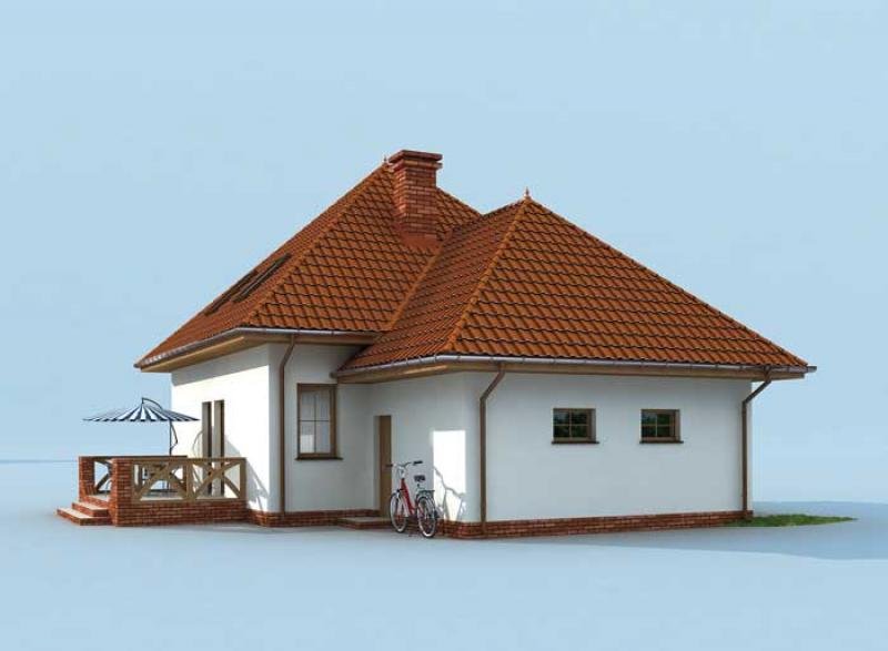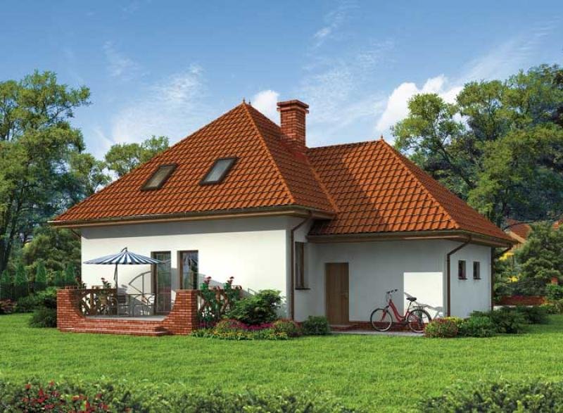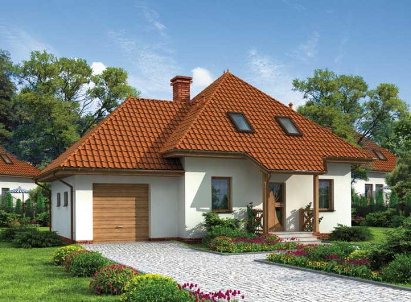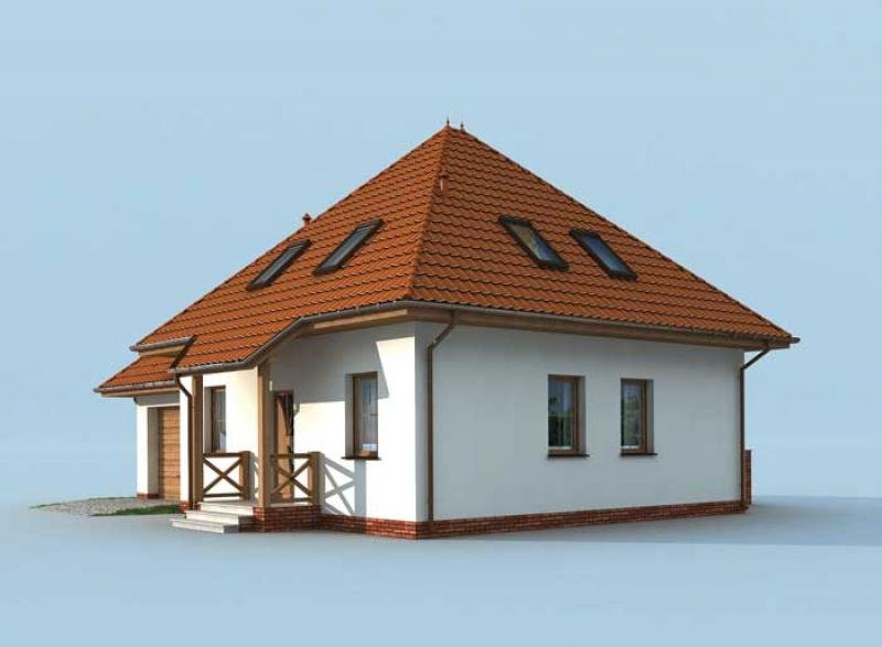 "Porto" Ten wytworny domek jest odpowiednim przykładem na to, że małe jest piękne! Spoglądając na przednią elewację budynku zauważymy nad drzwiami frontowymi zadziwiające zadaszenie, które powstało z przedłużenia powierzchni dachu (podobne znajduje się w projekcie Montana). Równie ciekawie prezentuje się asymetryczny dach, przypominający szczyty górskie, a to za sprawą wyniesienia wierzchołka części mieszkalnej nad garażowy. Została w ten sposób zaakcentowana odrębność centrum budynku od jej lewego skrzydła. Dodatkowo domek posiada niewielki taras, który posłuży za idealne miejsce, gdy przyjaciele zechcą wpaść na kawę i ciacho. Maksimum komfortu i prywatności, w tym jednorodzinnym domku z poddaszem, zapewnią pokój dzienny, kuchnia (z jadalnią), dwie łazienki oraz trzy sypialnie. Porto stanie się oczkiem w głowie właściciela- jak w nim zamieszka to już nigdy go nie opuści!