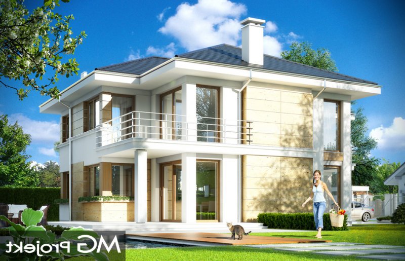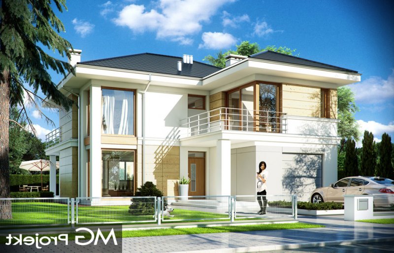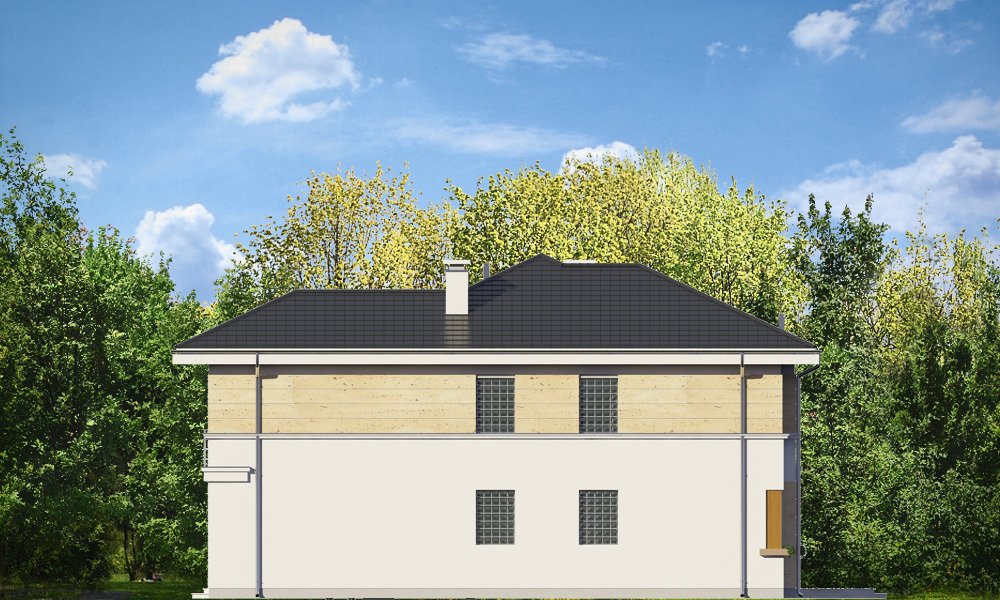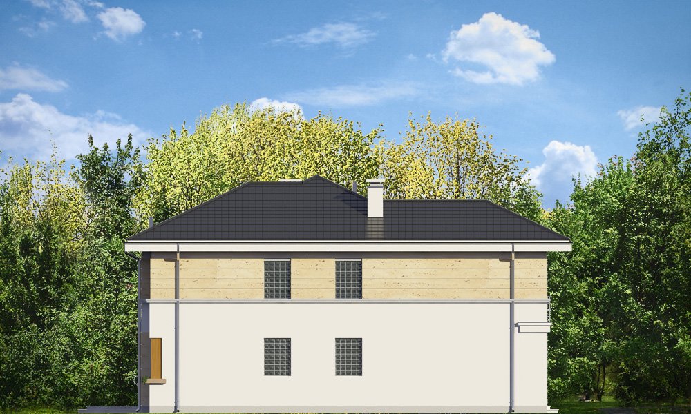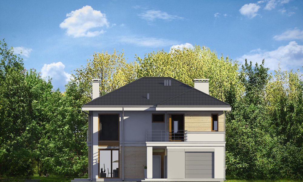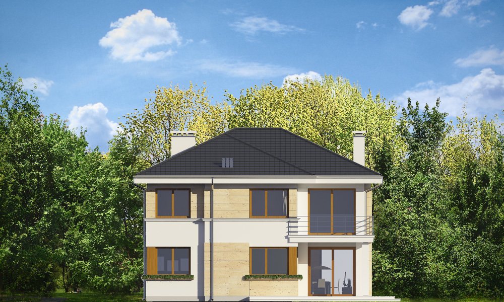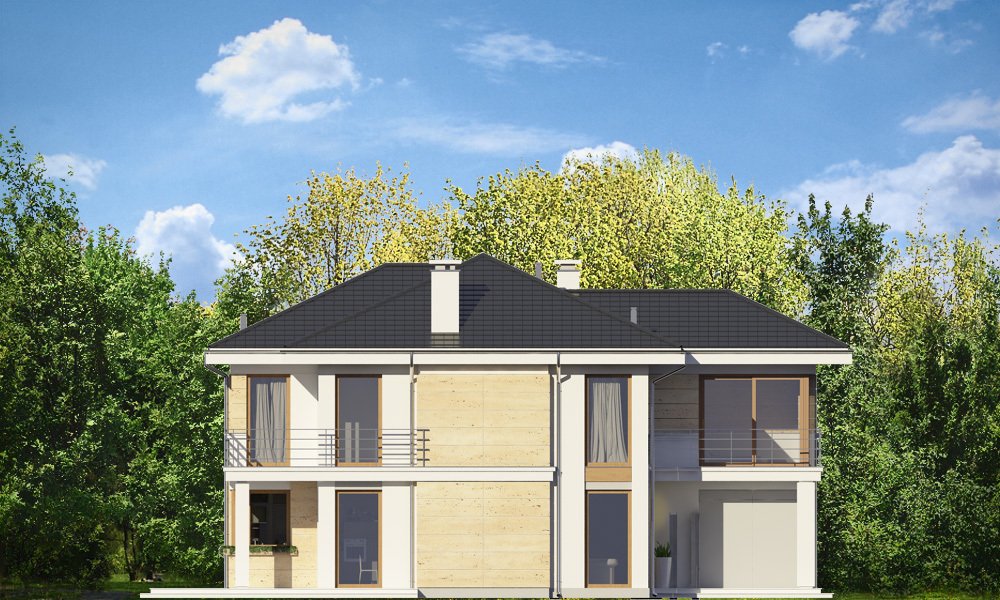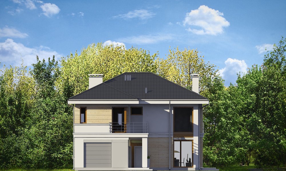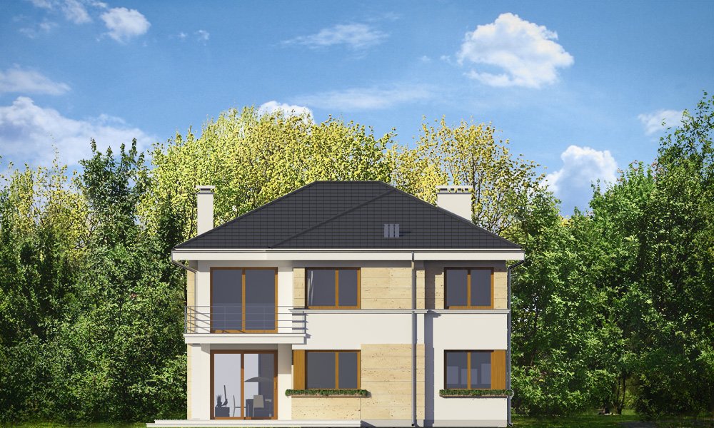 Riwiera 2 to dom przeznaczony dla cztero-sześcioosobowej rodziny. Budynek zaprojektowano w stylu miejskiej nowoczesnej willi, z łagodnymi dachami i dużymi przeszkleniami. Elewacje podzielone zostały na poziome pasy, a różne okładziny i kolory urozmaicają powierzchnie ścian. Znakiem firmowym „Riwiery 2” są piękne duże okna. Część z nich sięga od podłogi do sufitu, dzięki czemu z wnętrza dziennego domownicy będą mieli świetny widok na otaczający ogród. Środek domu podzielono na część dzienną na parterze, oraz sypialnie na piętrze. Do domu wchodzimy przez obszerną sień, z przejściem do garażu i pomieszczenia gospodarczego. Następnie przechodzimy do holu, połączonego z pokojem dziennym i kuchnią, które razem tworzą dużą otwartą przestrzeń. Z holu dostępne są także : schody na piętro, niewielka łazienka i dodatkowy pokój ( gabinet lub sypialnia gościnna ). Nad jadalnią zostawiono otwarty sufit na antresolę piętra, z oknami o wysokości dwóch kondygnacji, z widokiem na ogródek. Reprezentacyjna ściana kominkowo-telewizyjna będzie ozdobą całego domu. Z salonu wychodzimy na częściowo zadaszony taras i do ogrodu. Na piętrze przewidziano cztery sypialnie, w tym apartament rodziców w osobnej części domu, z własną łazienką i garderobą. Sypialnie dziecięce mają dodatkową łazienkę - z holu. Istnieje możliwość zamknięcia pustki nad salonem i zaprojektowania piątego pokoju na piętrze !. Riwiera 2 to przemyślany, bardzo funkcjonalny, energooszczędny dom jednorodzinny. Jego koszt budowy wypada korzystnie w stosunku do uzyskanej powierzchni ( pozbawionej skosów ), oraz komfortu i wygody mieszkania. Zapraszamy.