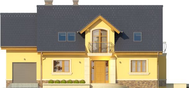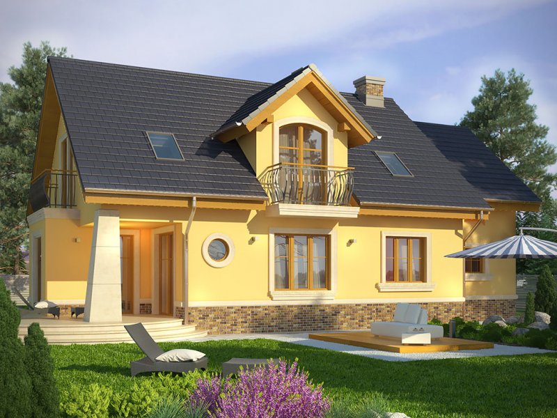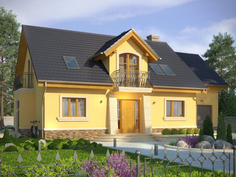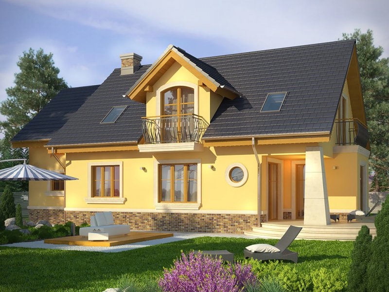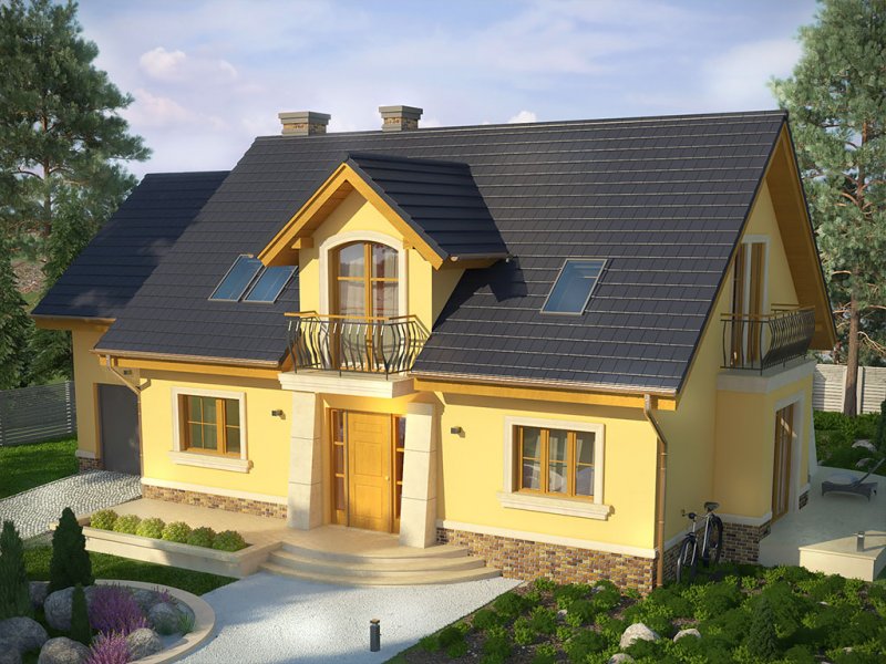 Ściany budynku zaprojektowano z betonu komórkowego zdociepleniem lub w innej technologii w ramach adaptacji. Stropgęstożebrowy, więźba drewniana, pokrycie dachówką ceramicznąlub cementową. Inne pokrycia w ramach adaptacji. Elewacjetynkowane, na fragmentach okładane płytką kamienną lub teżtynkowane w innym kolorze. Cokoły i kominy obłożone klinkierem.