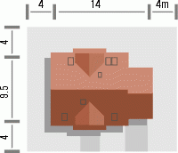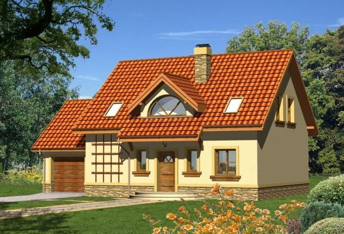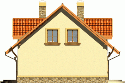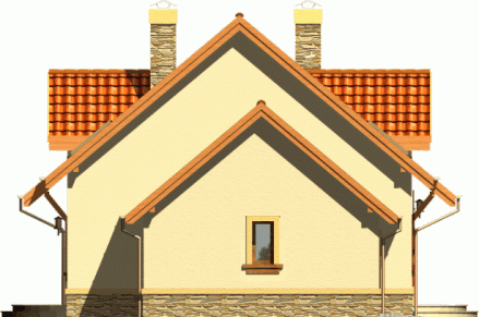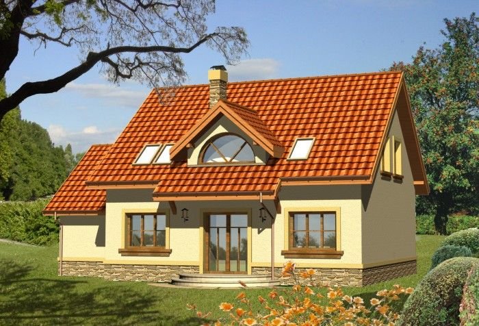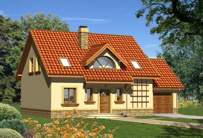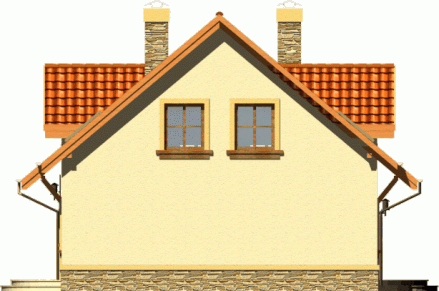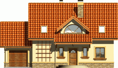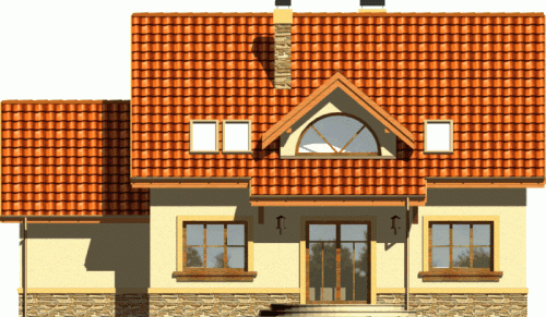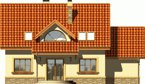 Klasyczny dom z dachem dwuspadowym z bryłą garażu dostawioną z boku. Uwagę zwracają harmonijne fasady z oknami ujętymi w opaski oraz podkreślone wejście i wyjście na taras obniżeniem dachu i lukarnami z reprezentacyjnymi łukowymi oknami.