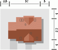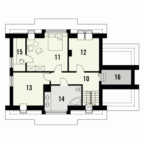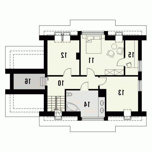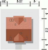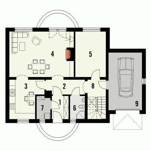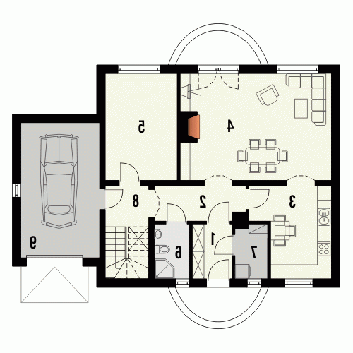 Budynek niepodpiwniczony piętrowy z garażem. Na parterze zaprojektowano pokój dzienny, kuchnię ze oraz wydzielony pokój, łazienkę i pom. gospodarcze. Wejście na poddasze schodami drewnianymi wydzielone optycznie od strefy dziennej. Na poddaszu znajdują się trzy pokoje i duża łazienka. Dokumentacja dostępna również w odbiciu lustrzanym.