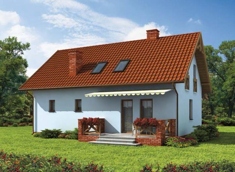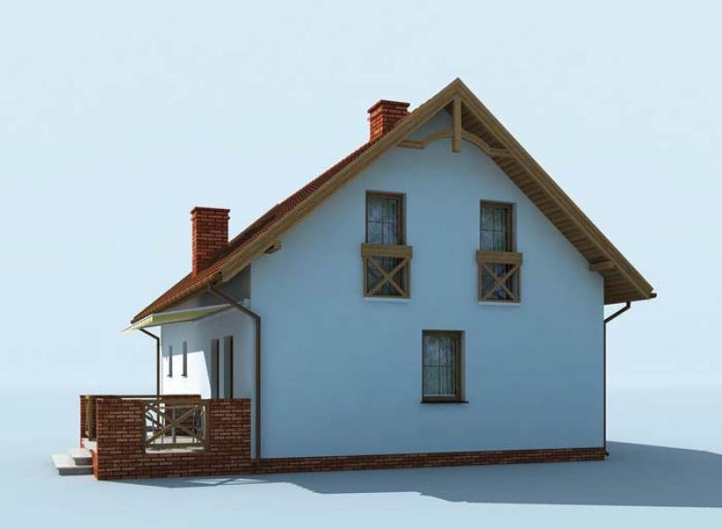 "Trypolis" Niewielki niepodpiwniczony domek jednorodzinny, niezwykle przemyślany i niedrogi w utrzymaniu. Z przodu domu znajduje się wjazd do garażu oraz wejście główne, umieszczone w centralnej części elewacji frontowej pod niewielkim zadaszeniem. Tył domu natomiast został zaprojektowany tak, by powstał tam wspaniały taras, który będzie stanowił doskonałe miejsce odpoczynku w ciepłe dni. Dach został zakończony na takiej wysokości, by możliwe była osłona tarasu poprzez zamontowanie dodatkowej markizy. Pokonawszy kilka schodków możemy skorzystać z głównego wejścia do domu. Znajdziemy się wówczas od razu w wiatrołapie, z którego będziemy mogli przejść do jednostanowiskowego garażu połączonego przejściem z kotłownią. Dom można podzielić na część dzienną umieszczoną na parterze i nocną – na piętrze. W części dziennej centralnym miejscem życia rodzinnego będzie zapewne pokój z kominkiem. Dodatkowym atutem pokoju dziennego jest wyjście na taras. Do ściany północnej parteru przylega niewielka łazienka z miejscem na kabinę prysznicową. Kuchnia została umiejętnie połączona z otwartą jadalnią umieszczoną przy jedynym oknie parteru, wychodzącym na zachód. Wspaniałym doświadczeniem dla mieszkańców domu będzie widok zachodzącego słońca, obserwowany, w zależności od pory roku, przy podwieczorku lub kolacji. Poddasze natomiast zostało wyposażone w ogromną łazienkę z wanną, posiadającą, podobnie, jak pokój obok, wyjście na niewielki balkon. Na poddaszu mamy jeszcze dodatkowo dwa pokoje, które możemy urządzić w zależności od potrzeb i gustu domowników. Ten dom jest niewątpliwie komfortowym rozwiązaniem dla czteroosobowej rodziny. Będzie stanowił spełnienie marzeń o własnym, niedrogim, rodzinnym gnieździe.