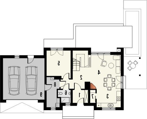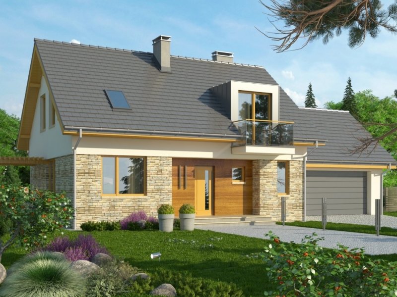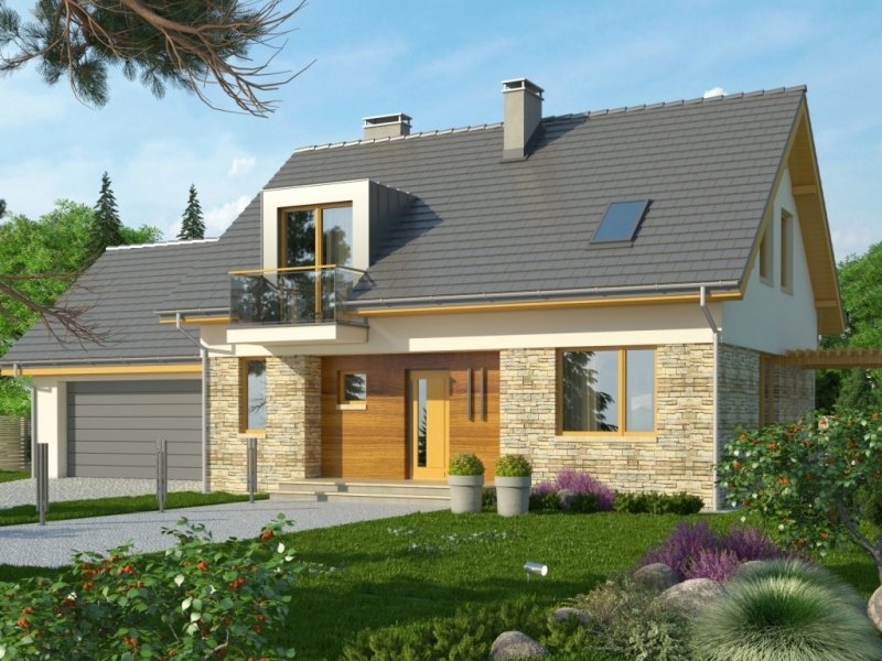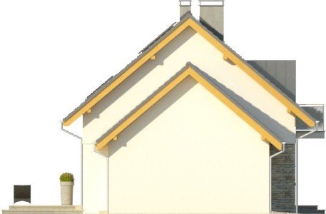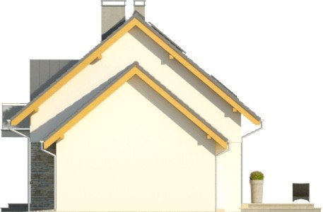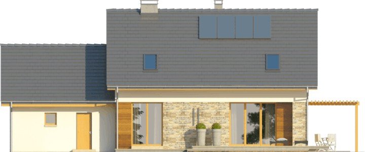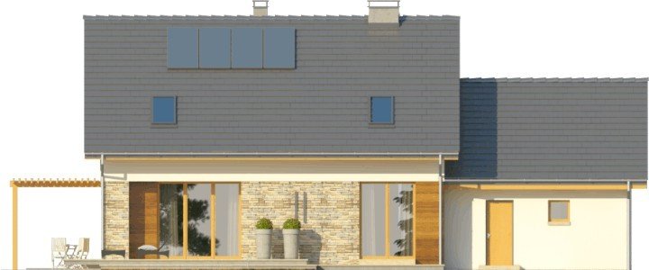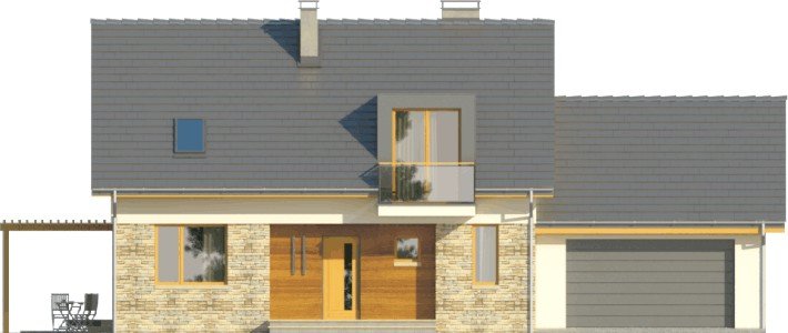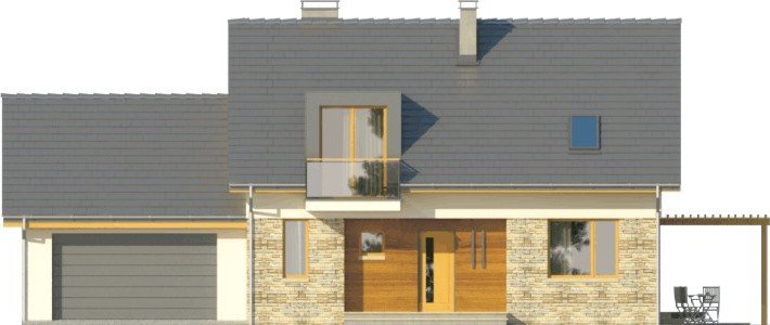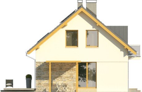 Piętrowy dom z dwustanowiskowym garażem. Na parterze zaprojektowano przestronną strefę dzienną: salon z jadalnią, otwarta kuchnia ze spiżarnią, a także dodatkowy pokój, łazienka i pomieszczenie gospodarcze. Na poddaszu, pod dachem stromym znajdują się trzy niemałe sypialnie, łazienka oraz strych. Projekt dostępny też w wersji lustrzanej.Tani w realizacji dom przykryty dachem dwuspadowym. Nowoczesny wygląd zewnętrzny wyróżnia go spośród innych domów. Duże przeszklenia od strony ogrodu świetnie doświetlają wnętrze, a efektowna elewacja frontowa z prostokątną lukarną na pewno przyciągnie wzrok przechodniów.