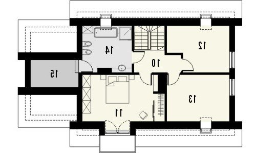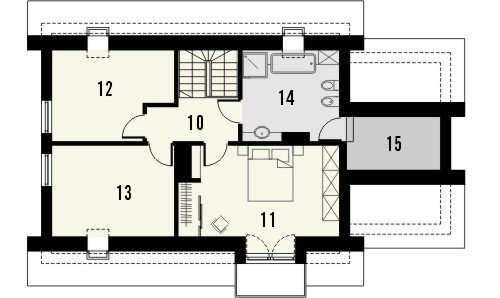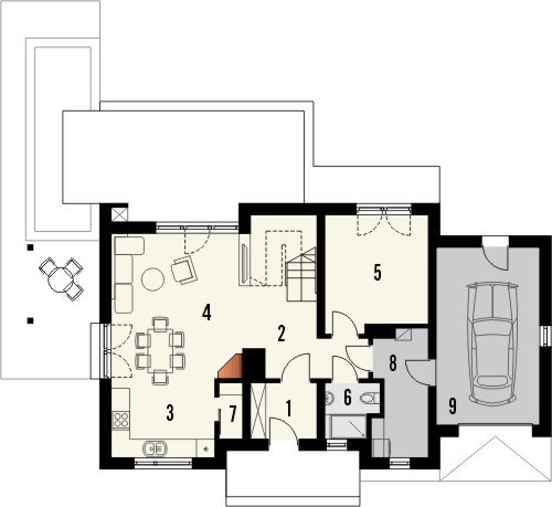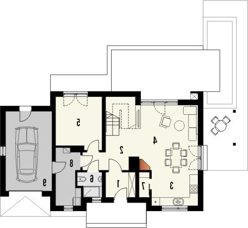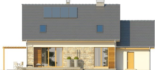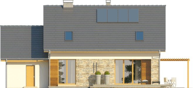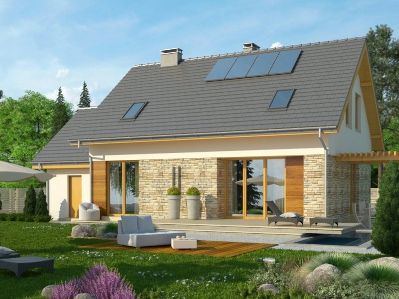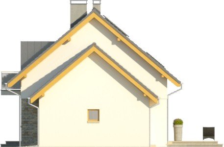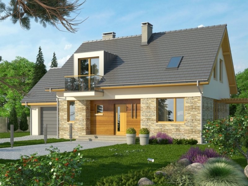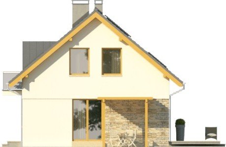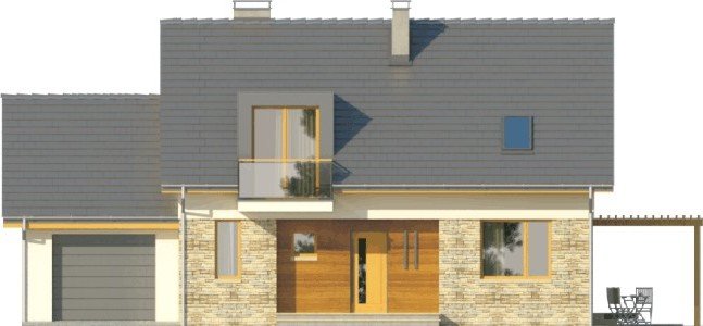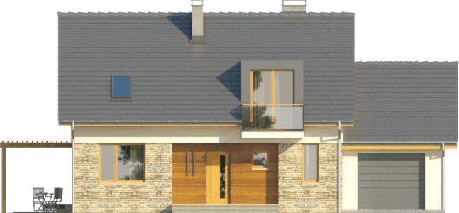 Projekt domu piętrowego z garażem na jedno auto. Na parterze pokój dzienny z jadalnią i kuchnią tworzą otwartą przestrzeń. Dalej znajduje się dodatkowy pokój, łazienka oraz pomieszczenie gospodarcze. Poddasze zajmują trzy sypialnie, duża łazienka oraz strych idealny na domowy magazynek. Dokumentacja przygotowana jest także w odbiciu lustrzanym.Dom o prostej bryle z ekonomicznym dwuspadowym dachem. Nowoczesnego charakteru dodaje mu prostokątna lukarna z balkonem ze szklaną balustradą. Elewacja parteru pokryta kamieniem i drewnem oraz duże przeszklenia od strony ogroduW projekcie ściany zaprojektowano z betonu komórkowego ocieplone z zewnątrz. Strop jest gęstożebrowy typu Teriva. Więźba dachowa wykonana jest z drewna, a pokryć ją można dachówką ceramiczną lub cementową. Elewacje otynkowano, fragmenty obłożono płytką kamienną i drewnem. Innych materiałów można użyć na etapie adaptacji.
