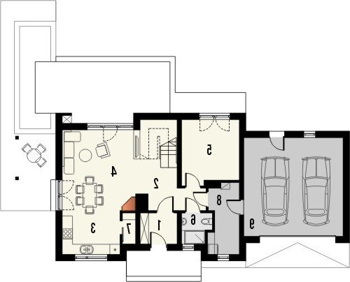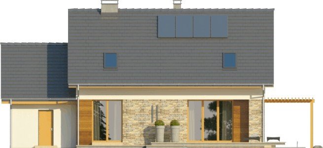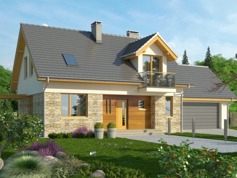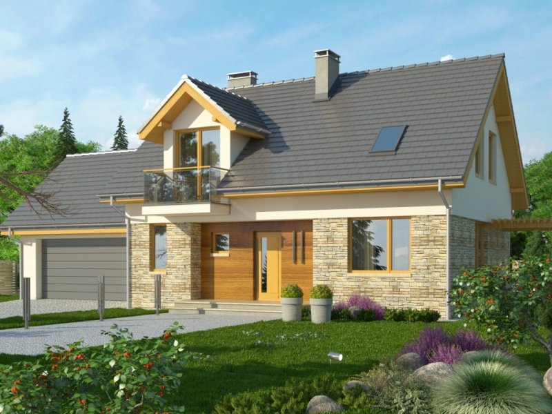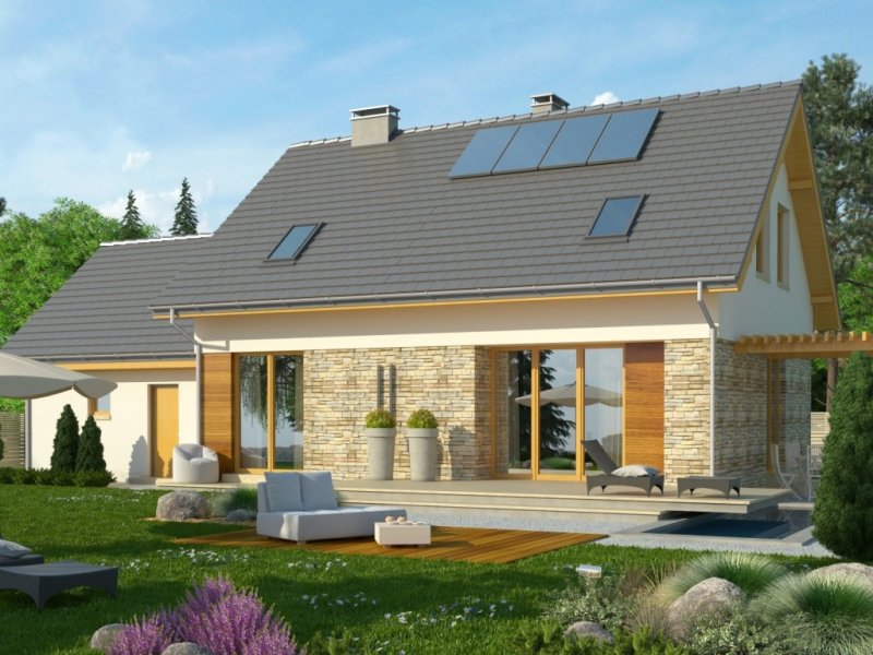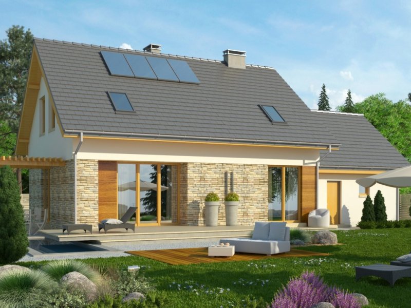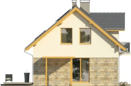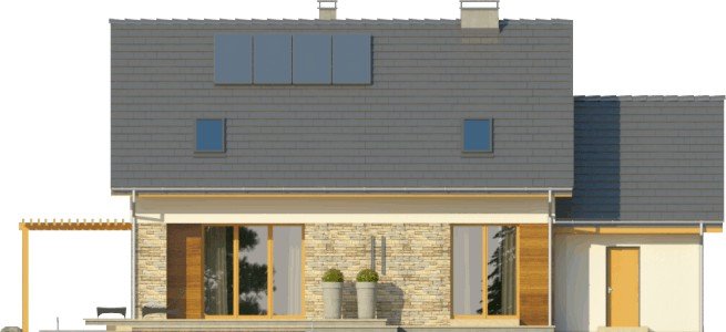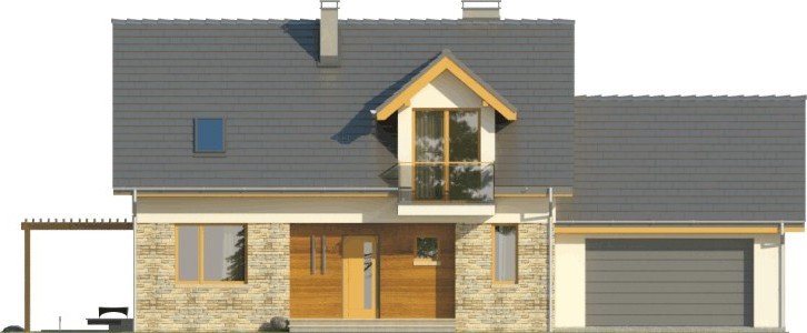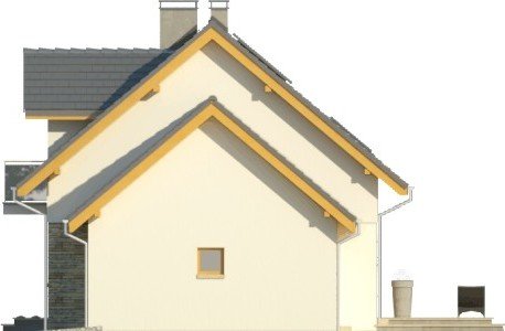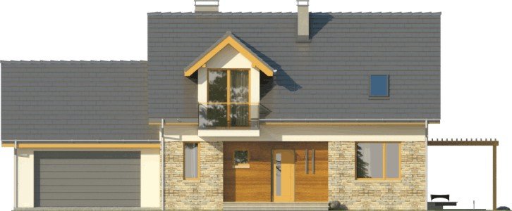 Dom jednorodzinny z garażem dwustanowiskowym. Na parterze zaprojektowano salon z jadalnią, otwartą kuchnię, spiżarnię, dodatkowy pokój idealny na gabinet lub pokój gościnny, łazienkę, pomieszczenie gospodarcze oraz wiatrołap z miejscem na szafę. Piętro domu zajmują trzy sypialnie, łazienka oraz strych. Projekt wykonany jest również w wersji lustrzanej.Budynek z nowoczesnymi detalami, przykryty dachem dwuspadowym. Dzięki nieskomplikowanej bryle koszty budowy będą niskie. Atutem tego domu są duże okna, które doskonale doświetlają jego wnętrze.W projekcie ściany wykonano z betonu komórkowego ocieplone styropianem. Strop jest gęstożebrowy typu Teriva, a więźba w całości drewniana. Dach można pokryć dachówką ceramiczną albo cementową, a elewacje otynkować oraz obłożyć wariantowo płytkami kamiennymi i drewnem. Inne technologie oraz materiały do użycia podczas adaptacji.