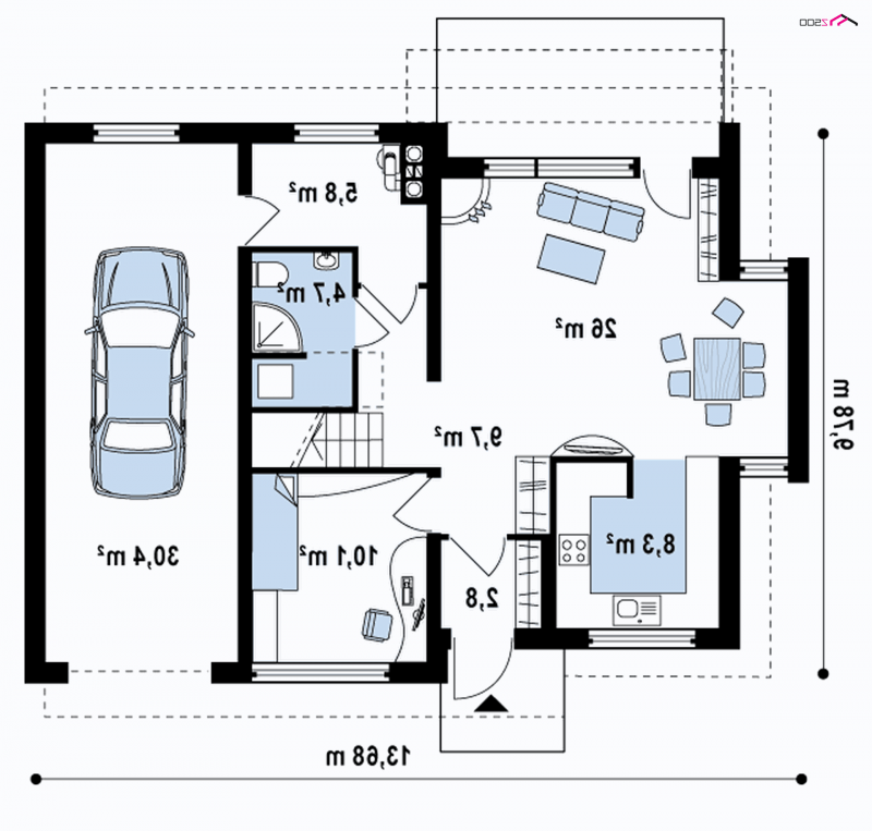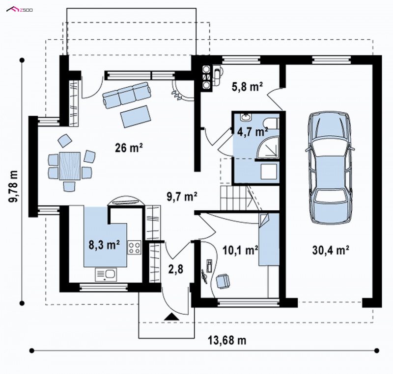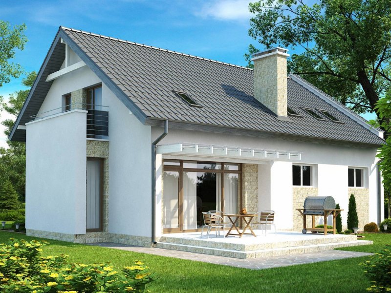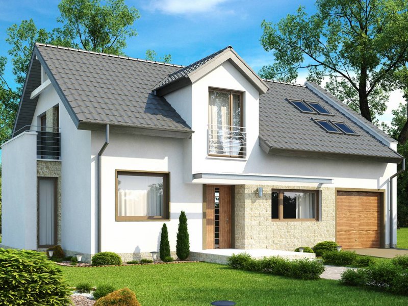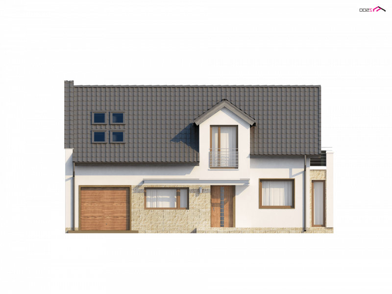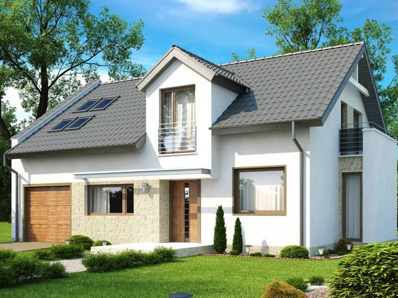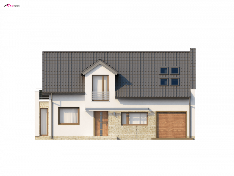 Z110 to ekonomiczny dom o zwartej formie z garażem jednostanowiskowym w bryle. Dodatkowo elementy elewacji wzbogacają walory estetyczne i dodają uroku.