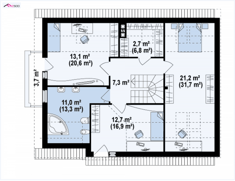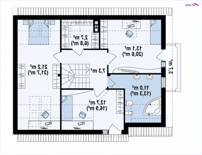 Na poddaszu znajdują się trzy sypialnie, z których jedna ma ponad 30 m2, obszerną garderobę i miejsce do pracy. Kolejna z sypialni ma prywatny balkon oraz wnękę na szafę. Jest także pokój kąpielowy z miejscem na dużą wannę z hydromasażem oraz ogólnodostępna garderoba. Projekt jest przystosowany również do zabudowy bliźniaczej.
