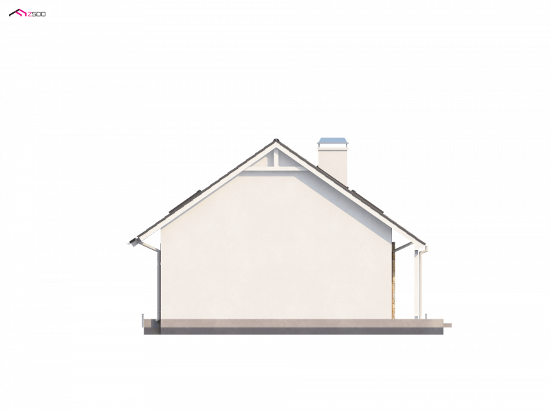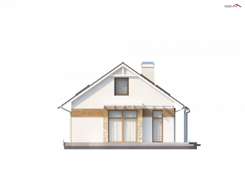 Program funkcjonalny poddasza to jednoprzestrzenna strefa dzienna w prawej części domu - przestronny salon połączony z kuchnią oraz jadalnią w wykuszu. Z prawej strony domu zaprojektowany został duży taras. Najokazalszą częścią domu jest salon i kuchnia. Połączenie tych pomieszczeń daje niepowtarzalnie dużą przestrzeń. Na parterze zaplanowano również obszerną sień z pojemną szafą, pomieszczenie gospodarcze, dodatkowy pokój gościnny oraz niewielką spiżarkę. Wygodne schody ze spocznikiem prowadzą do strefy nocnej na piętrze. Są tu trzy komfortowe sypialnie oraz spora łazienka.