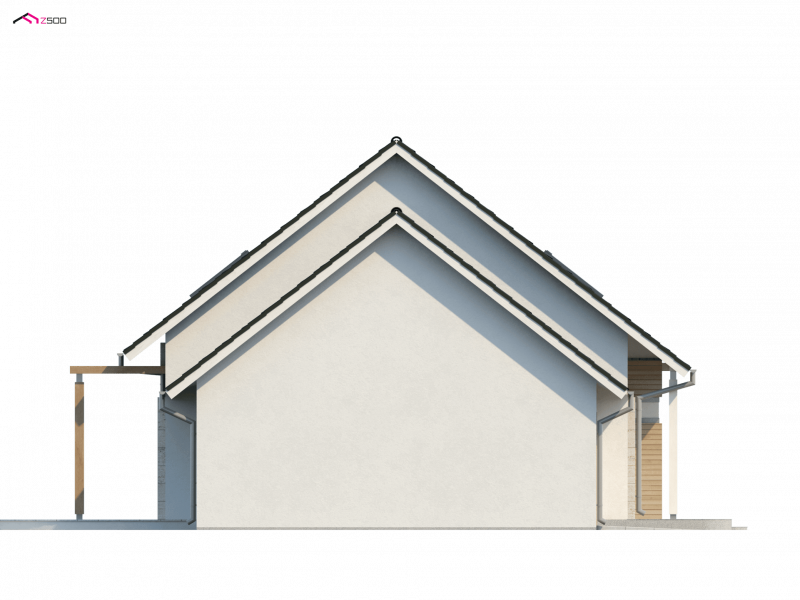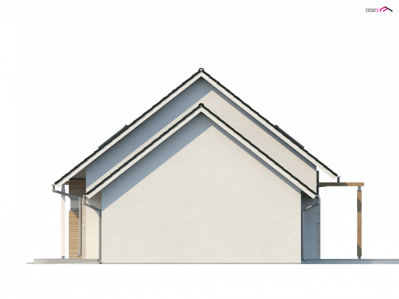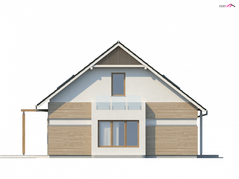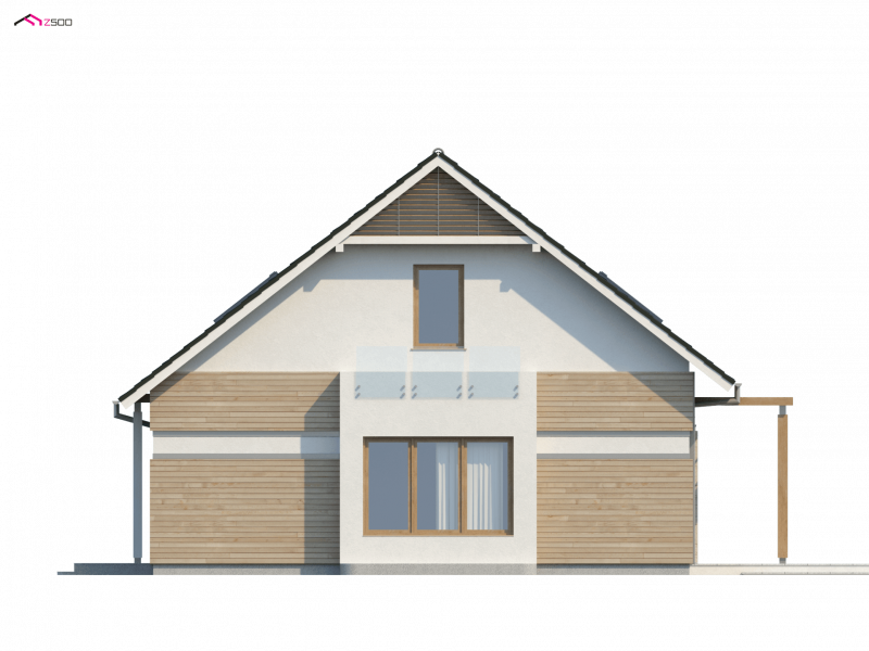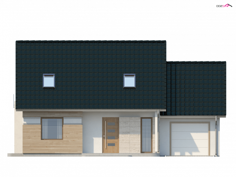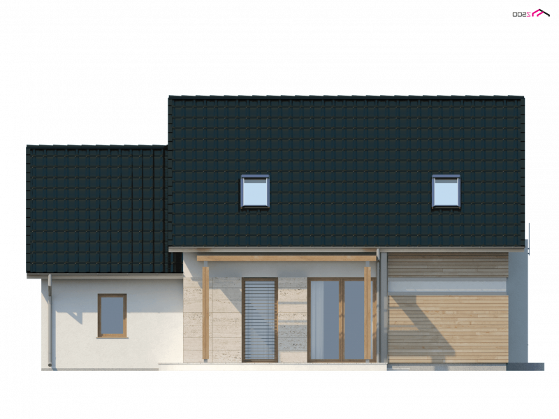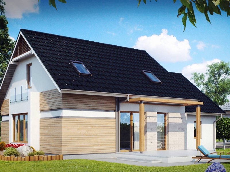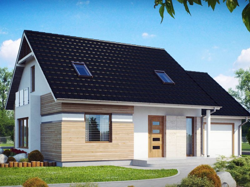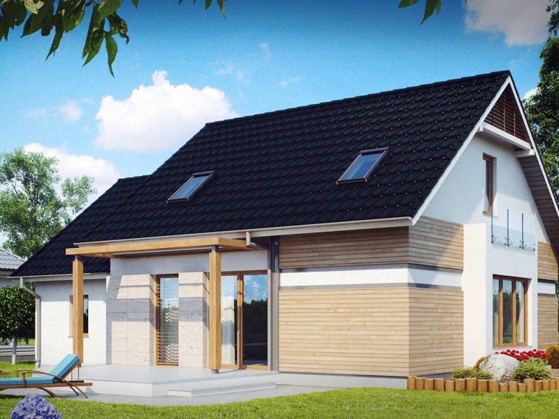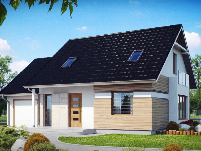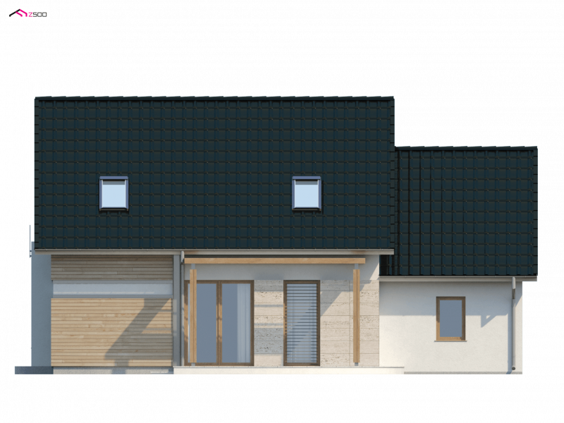 Z 114 to przytulny i komfortowy dom z garażem. Modna, ciemna dachówka świetnie podkreśla jego nowoczesny charakter, a drewniane elementy elewacji dodają uroku.