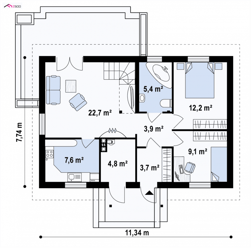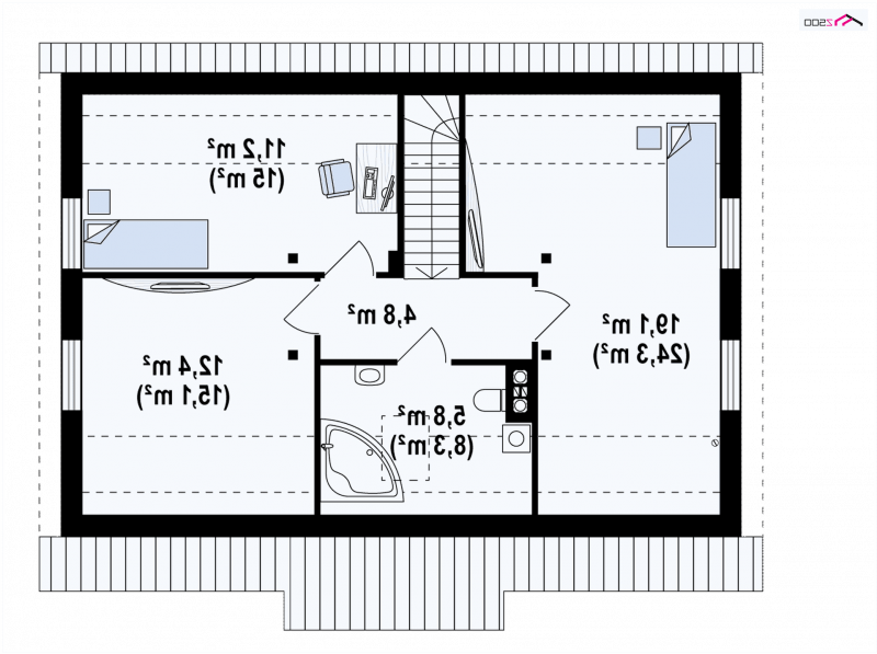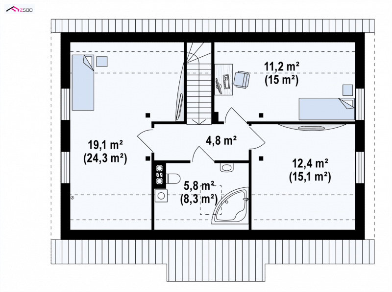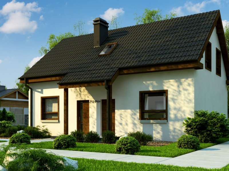 Z12 P h+ to dom parterowy z Poddaszem użytkowym. Prosta bryła oraz możliwością etapowania inwestycji czynią go tanią i ekonomiczną inwestycją.
