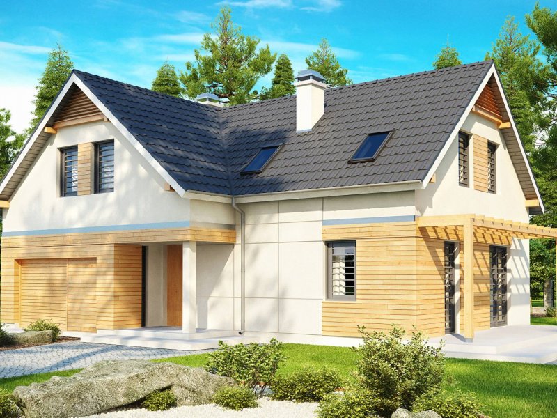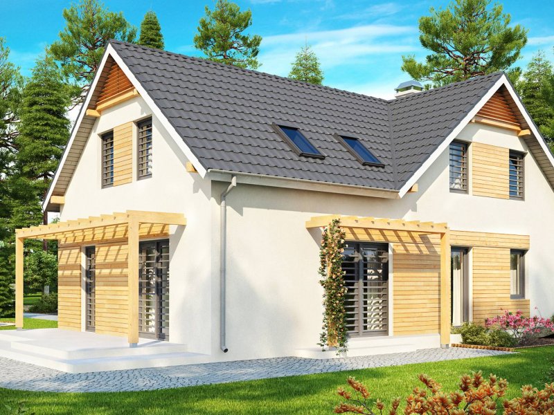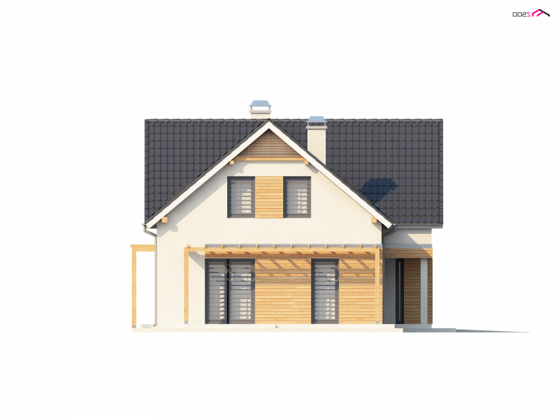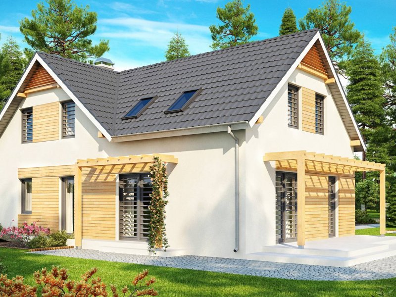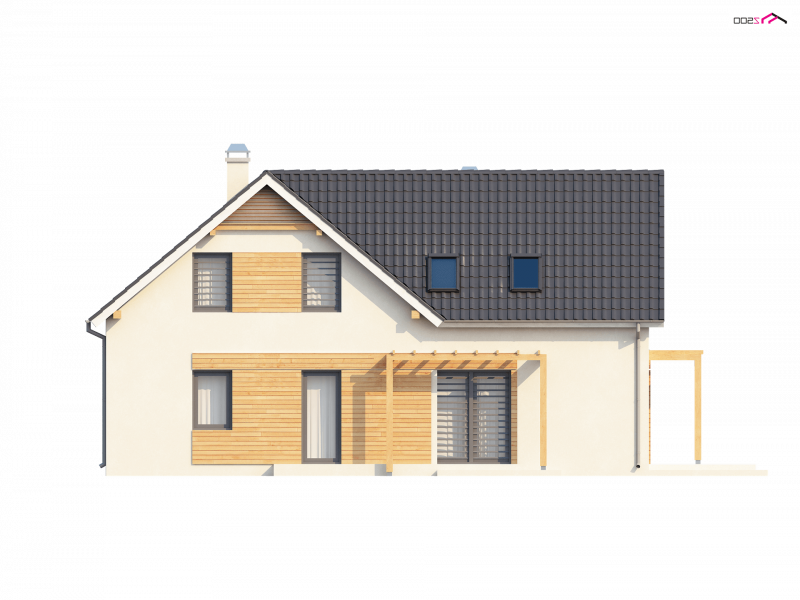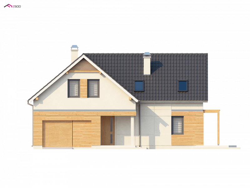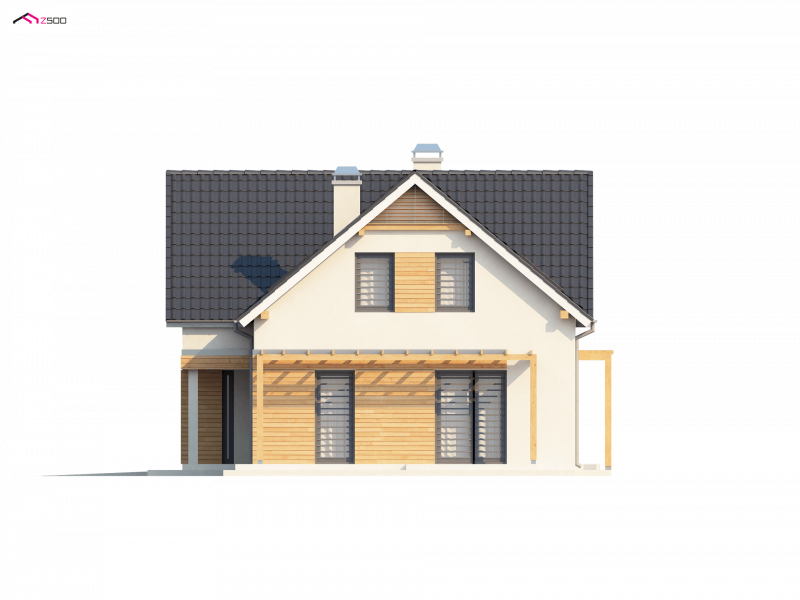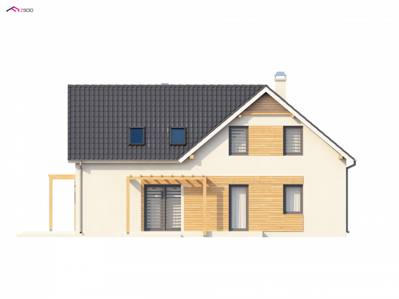 Projekt Z125 to dom z poddaszem użytkowym dla lubiących duże przestrzenie. Jasne palety barw oraz drewniane elementy elewacji dodają mu uroku i przyjemnego wyglądu. Dzięki fajnej okładzinie z drewna, szarej stolarce okiennej oraz dopasowanej pergoli, dom jest wyjątkowy i jedyny w swoim rodzaju.