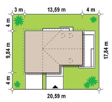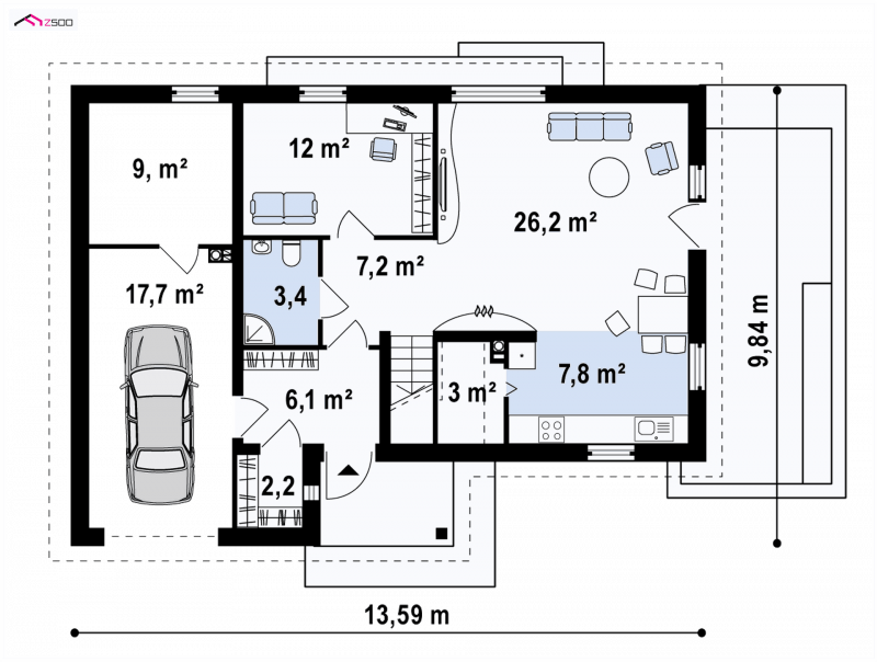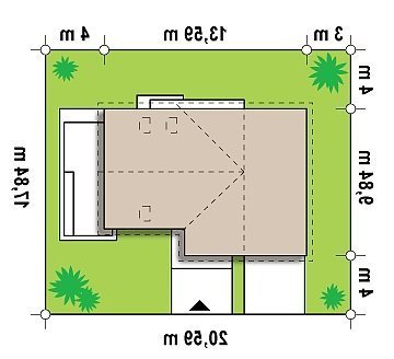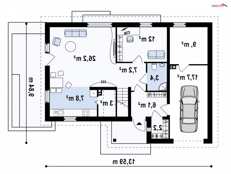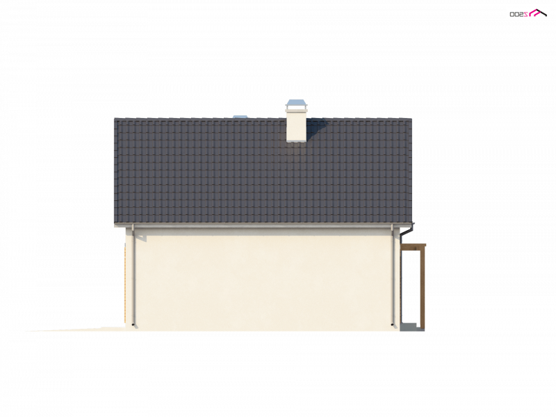 Najważniejszą częścią projektu jest jasny, pokaźny salon z miejscem na aneks TV i szafki na książki. To idealne miejsce do radosnych spotkań z bliskimi. Sąsiadujący z salonem taras, wspaniale sprawdzi się podczas wiosennego grilla czy letnich imprez. Otwarta kompozycja kuchni, dodaje przestrzeni całemu pomieszczeniu. Duże okna pozwolą na podziwianie pięknie urządzonego ogrodu. Pokój na parterze, z powodzeniem może służyć jako sypialnia dla gości lub gabinet do pracy. Garaż jednostanowiskowy posiada własne pomieszczenie gospodarcze niezbędne do przechowywania ogrodowych narzędzi. Łączy się z domem wspólną sienią, z wydzieloną garderobą. Należy zaznaczyć, że sień jest wielkości małego pokoju.