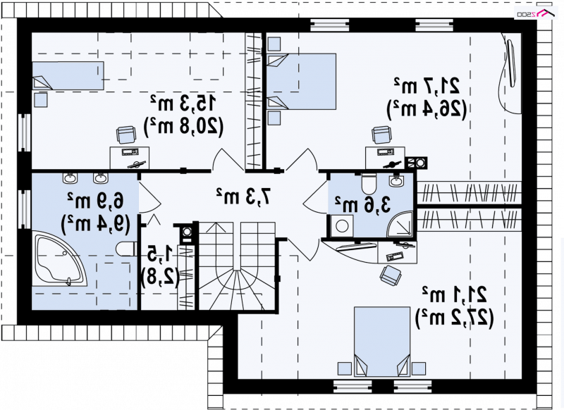 Na piętrze znajdują się trzy na prawdę duże i wygodne sypialnie, każda ponad 20m2. Można je podzielić na mniejsze na etapie budowy. Każda posiada miejsce na pojemną szafę wnękową, a największa – dedykowana rodzicom - posiada własną, osobistą garderobę. Dla pełnej satysfakcji, są tu również dwie wygodne łazienki. Do mniejszej można przemieścić drzwi bezpośrednio z jednej z sypialń i zaadaptować jako prywatny pokoik kąpielowy.