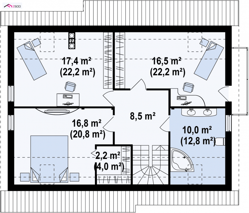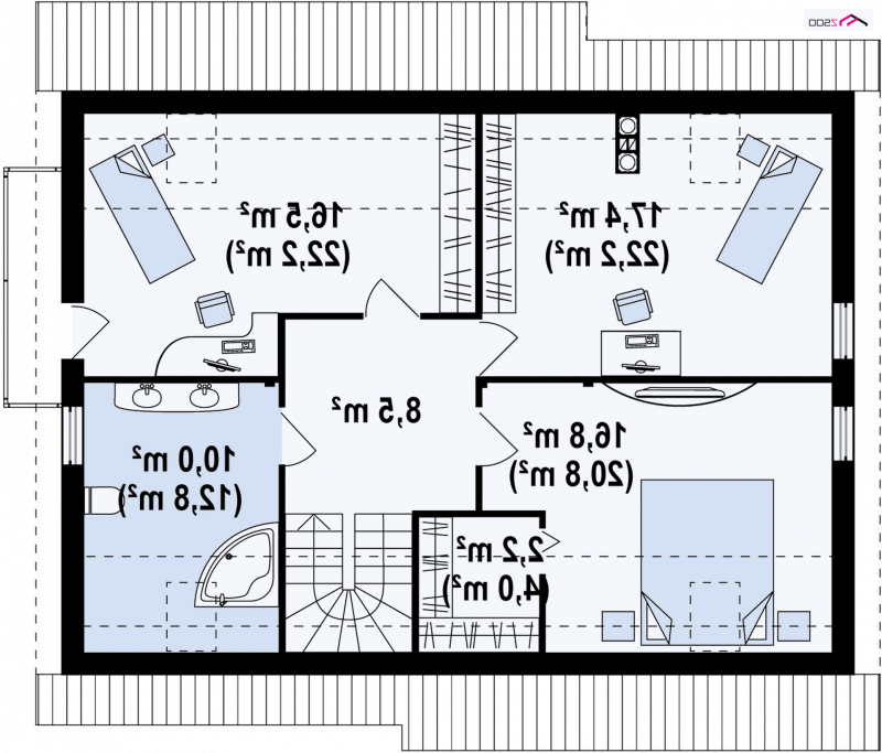 Niebywałą zaletą projektu Z129 jest duży, przestronny salon. Jest tu miejsce na wygodną jadalnię, oraz nowoczesny zakątek kina domowego.Płomienie, delikatnie iskrzące w kominku, wnioszą ciepło i magiczny klimat w zimowe dni. Praktyczna, nowatorsko urządzona kuchnia, pozwoli na szybkie i łatwe przygotowywanie posiłków. Funkcjonalny garaż posiada odrębne pomieszczenie gospodarcze, niezbędne do przechowywania ogrodowych narządzi. Część nocną domu stanowią trzy przestronne sypialnie na piętrze. Posiadają dodatkowe, nadzwyczajne zalety takie jak: osobne wyjście balkonowe, czy własna podręczna garderoba. Na piętrze znajduje się także wygodna, komfortowa łazienka z odprężającą wanną.