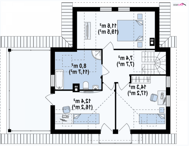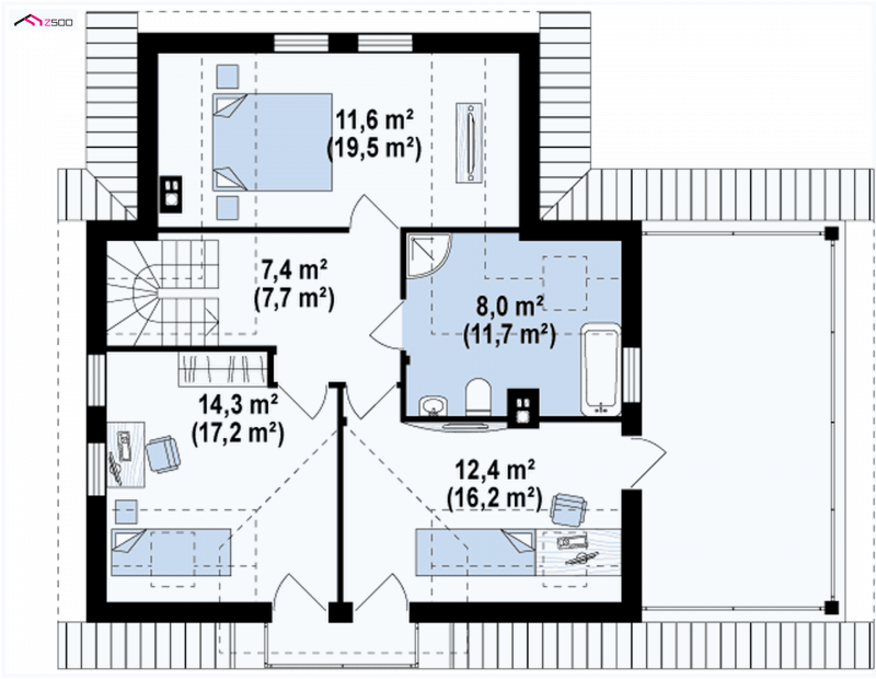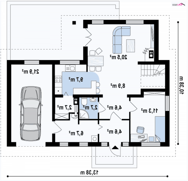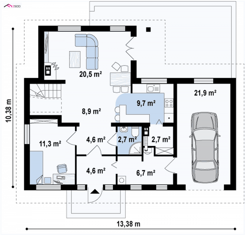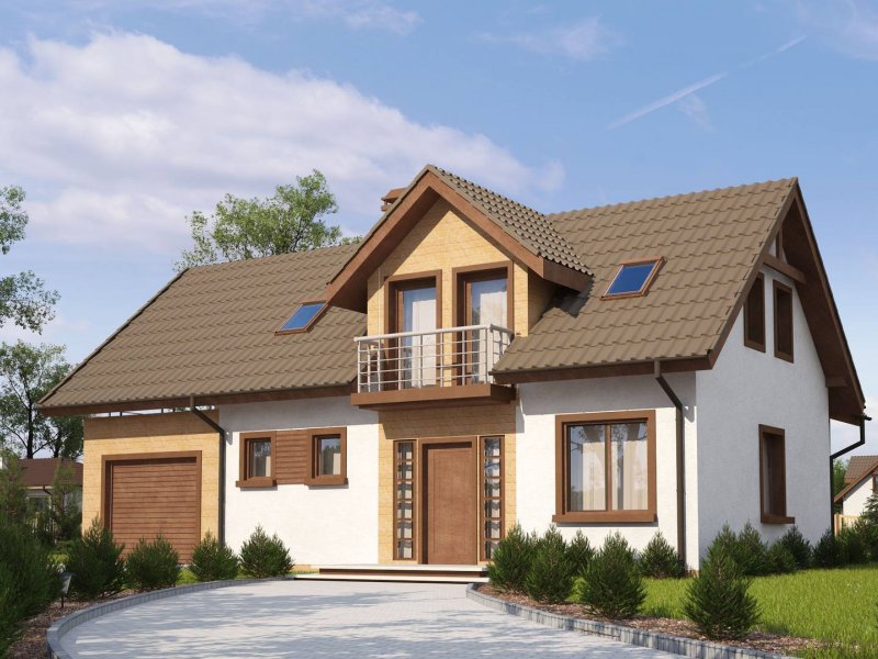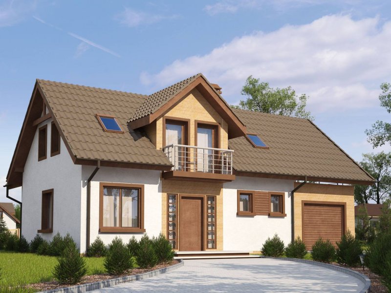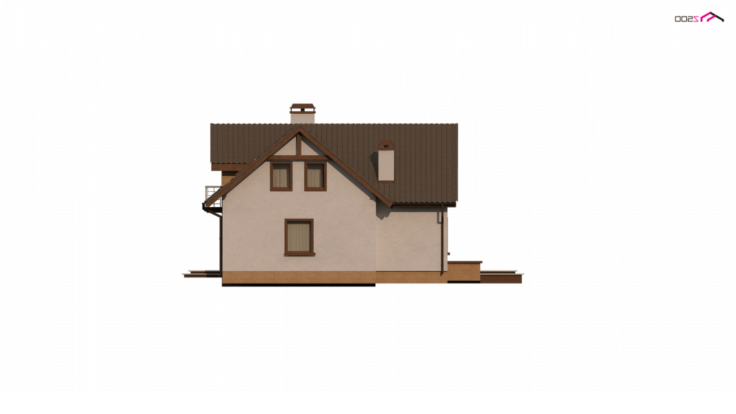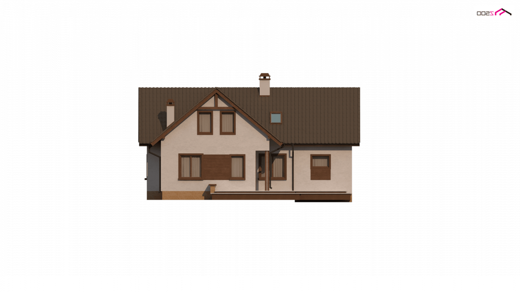 Wersja podstawowa domku Z13 z garażem po prawej stronie. Nad garażem przewidziano miejsce na zadaszony taras, można wykorzystać tą przestrzeń również jako dodatkowe pomieszczenie, powiększając powierzchnię poddasza.