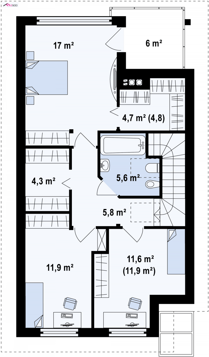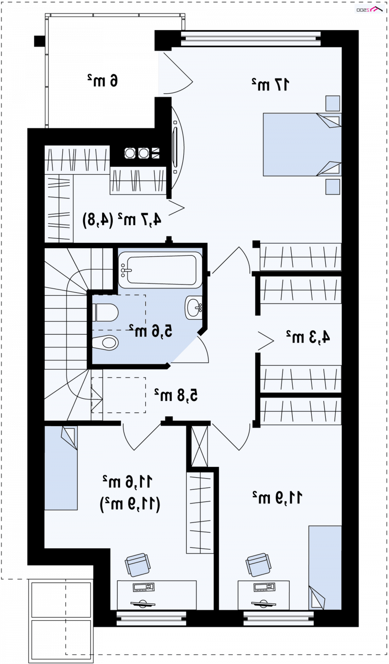 Centralnie usytuowane schody świetnie obsługują pokoje na piętrze. Na strefę nocną składają się trzy komfortowe sypialnie, łazienka i dwie duże garderoby. Główna sypialnia posiada wyjście na duży balkon z widokiem na ogród oraz własną garderobę.